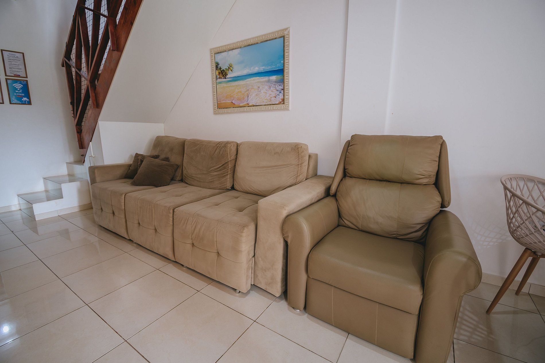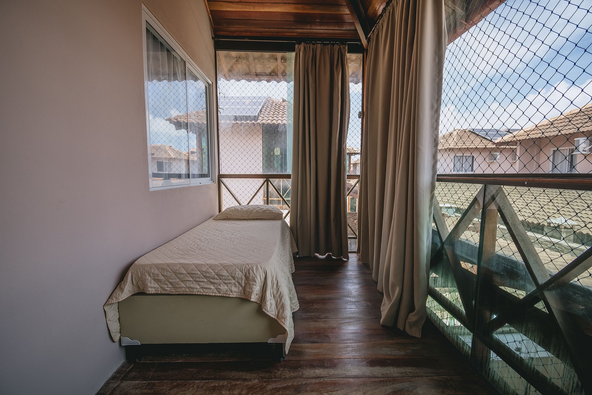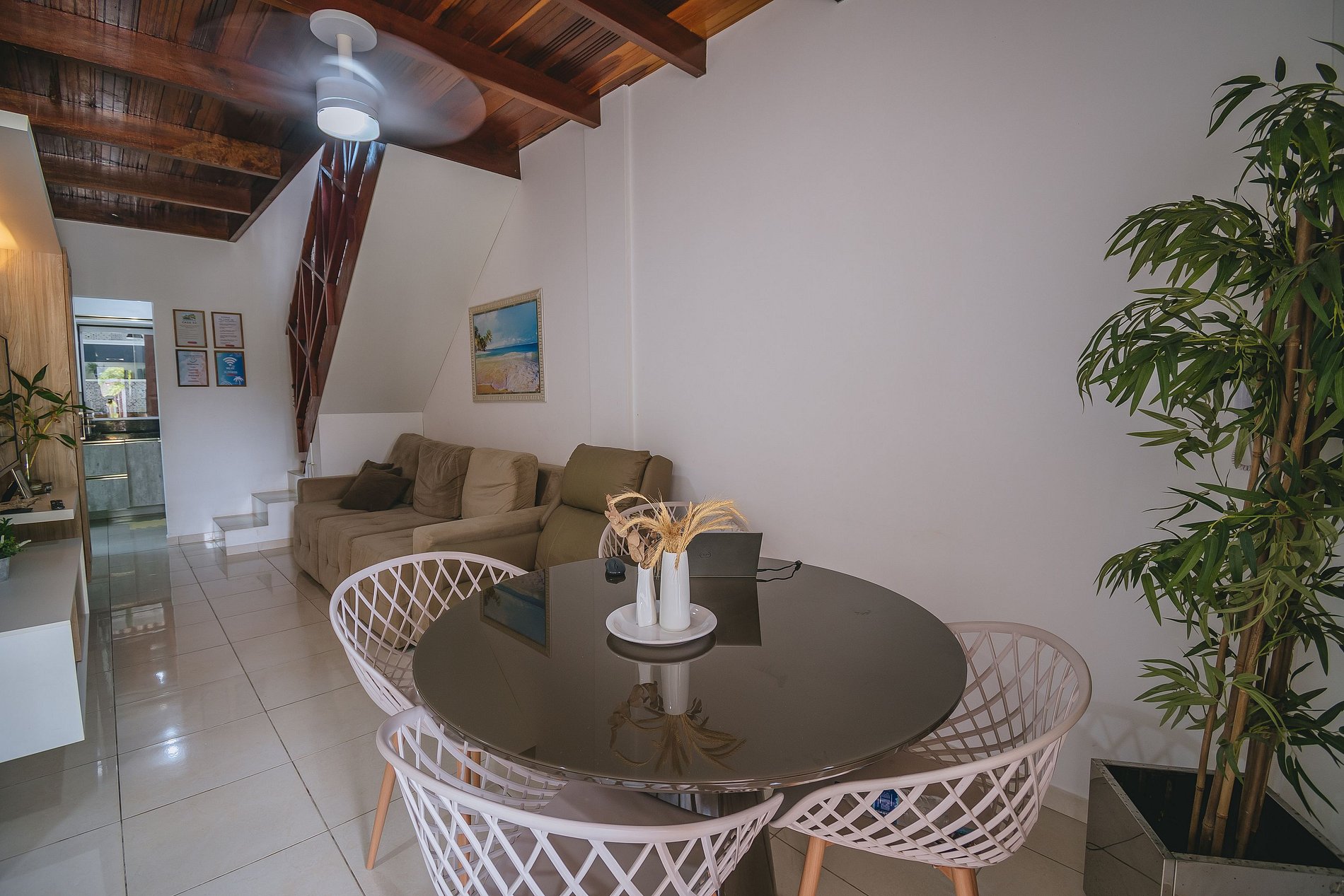 O interior da casa é totalmente mobiliado e equipado, contando com cozinha completa (eletrodomésticos e utensílios), sala de estar e duas varandas no pavimento superior, proporcionando ambientes bem ventilados e agradáveis.