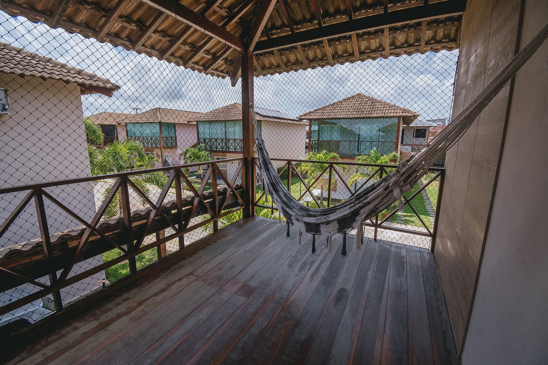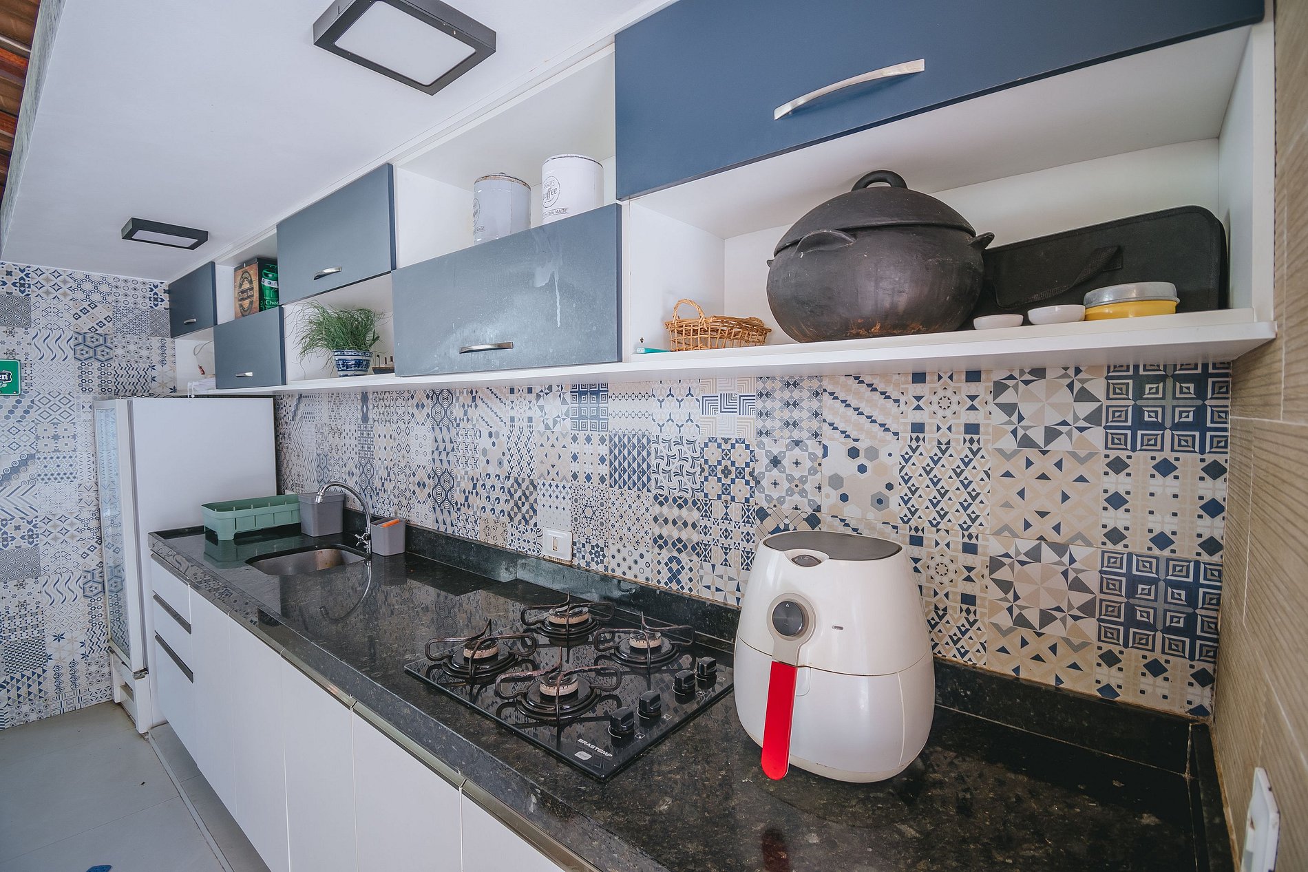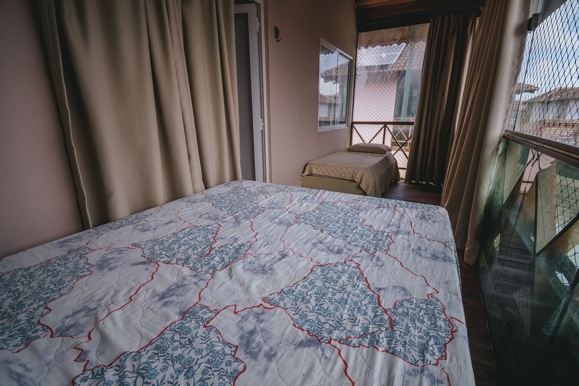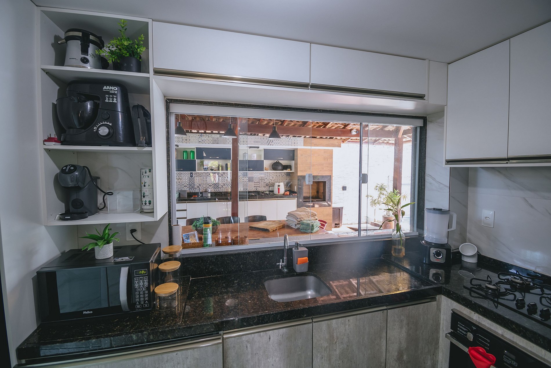 O interior da casa é totalmente mobiliado e equipado, contando com cozinha completa (eletrodomésticos e utensílios), sala de estar e duas varandas no pavimento superior, proporcionando ambientes bem ventilados e agradáveis.