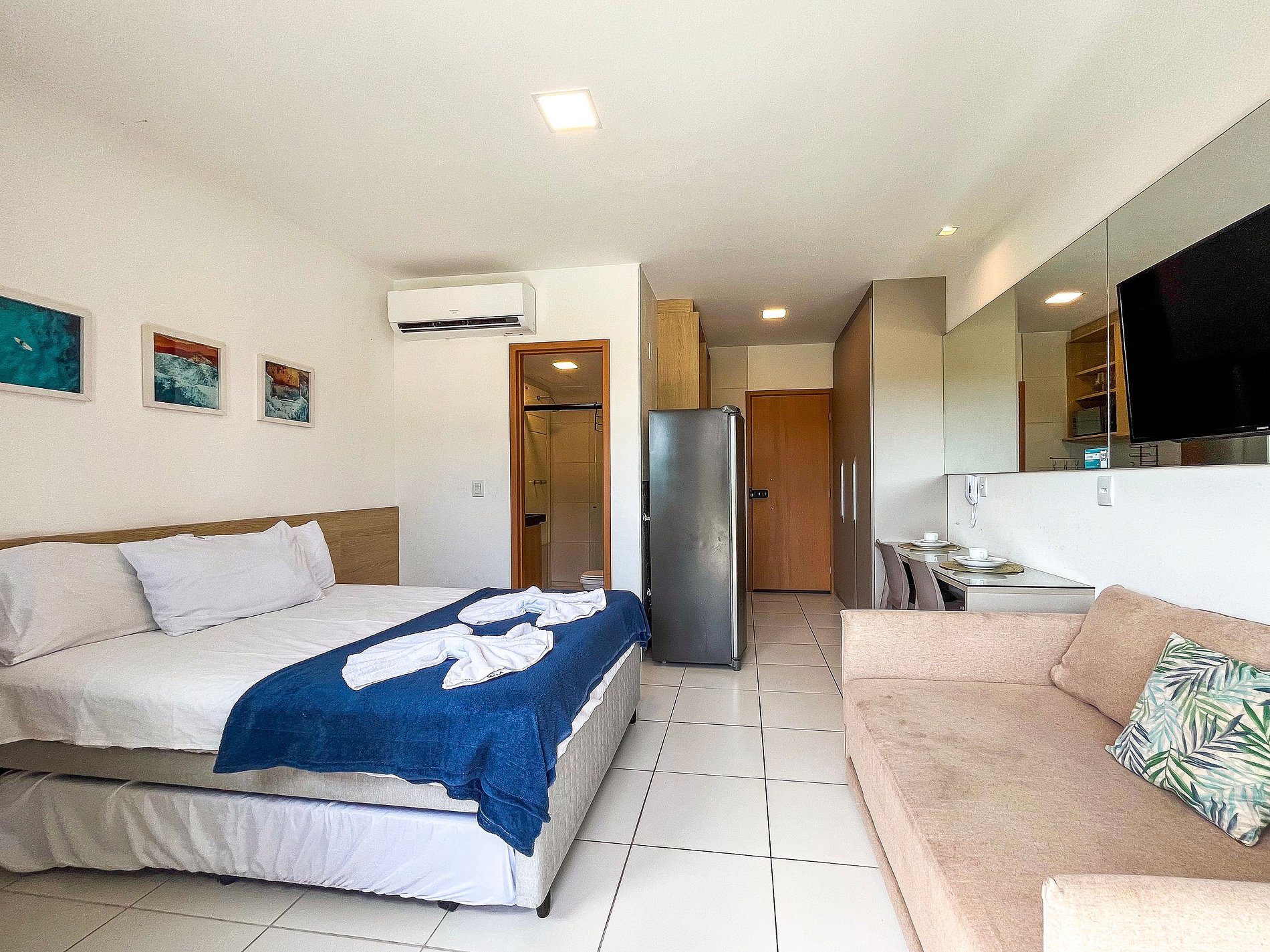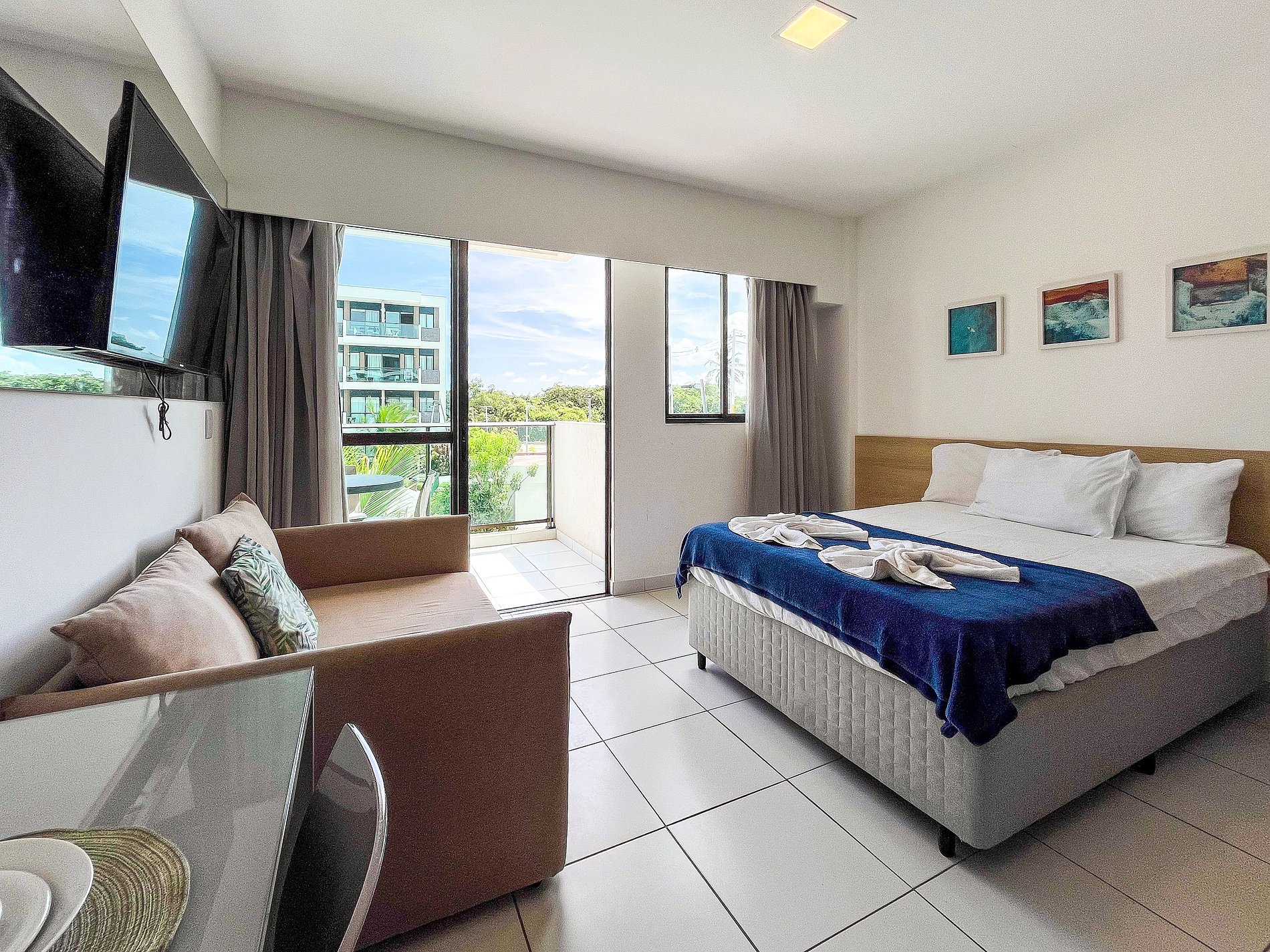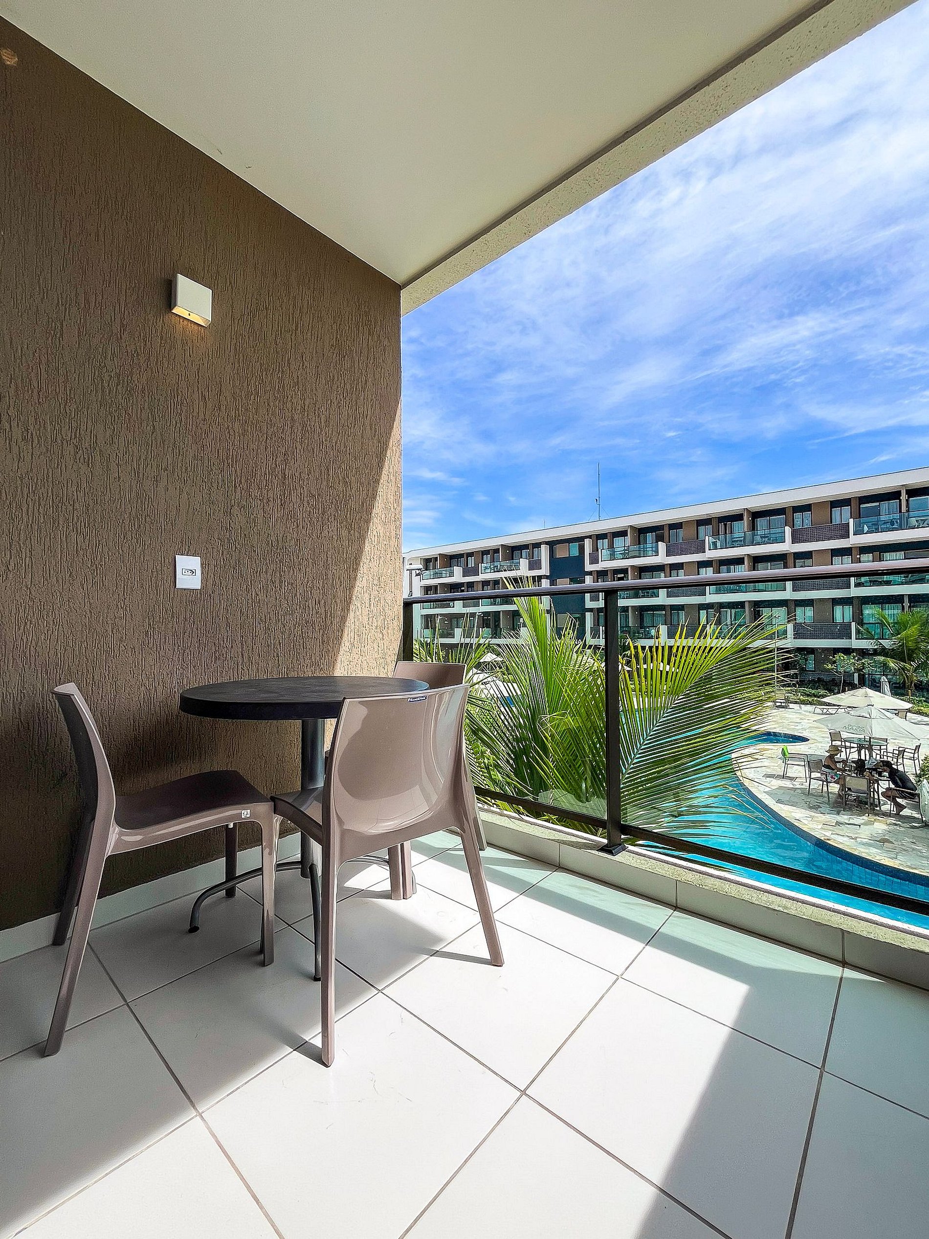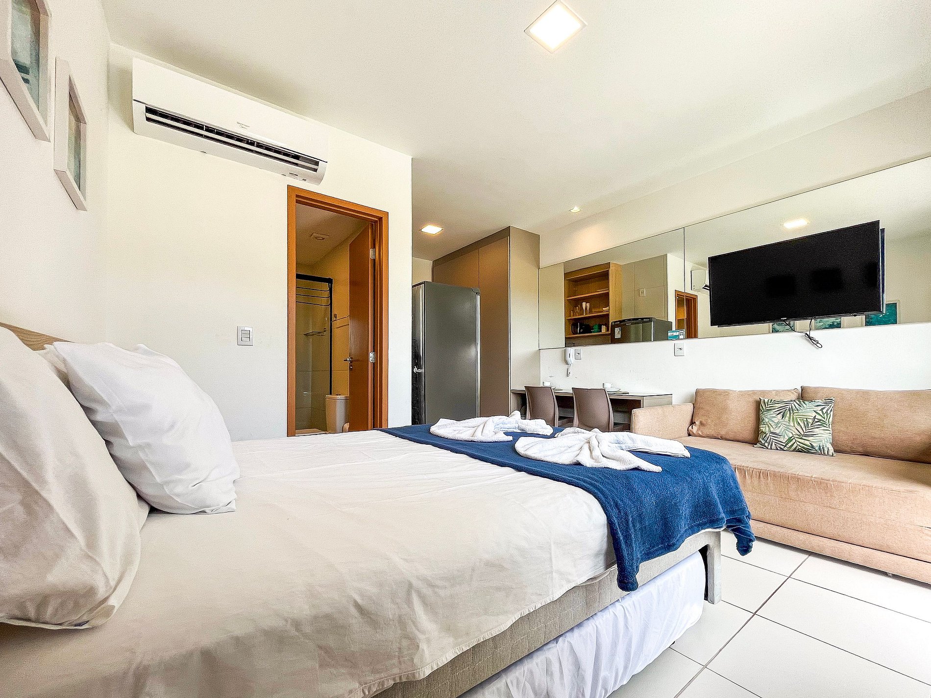 O apartamento de 30 m² acomoda até quatro pessoas com o conforto que você precisa: ar-condicionado, TV, Wi-Fi, varanda e uma cozinha compacta equipada, ideal para quem busca uma estadia funcional e agradável pertinho da praia. É o lugar ideal para quem deseja curtir a praia com conforto. Entre os principais atrativos estão piscina, jacuzzi, academia, restaurante, salão de jogos, campo de futebol, academia e espaços amplos para momentos de descanso e diversão.