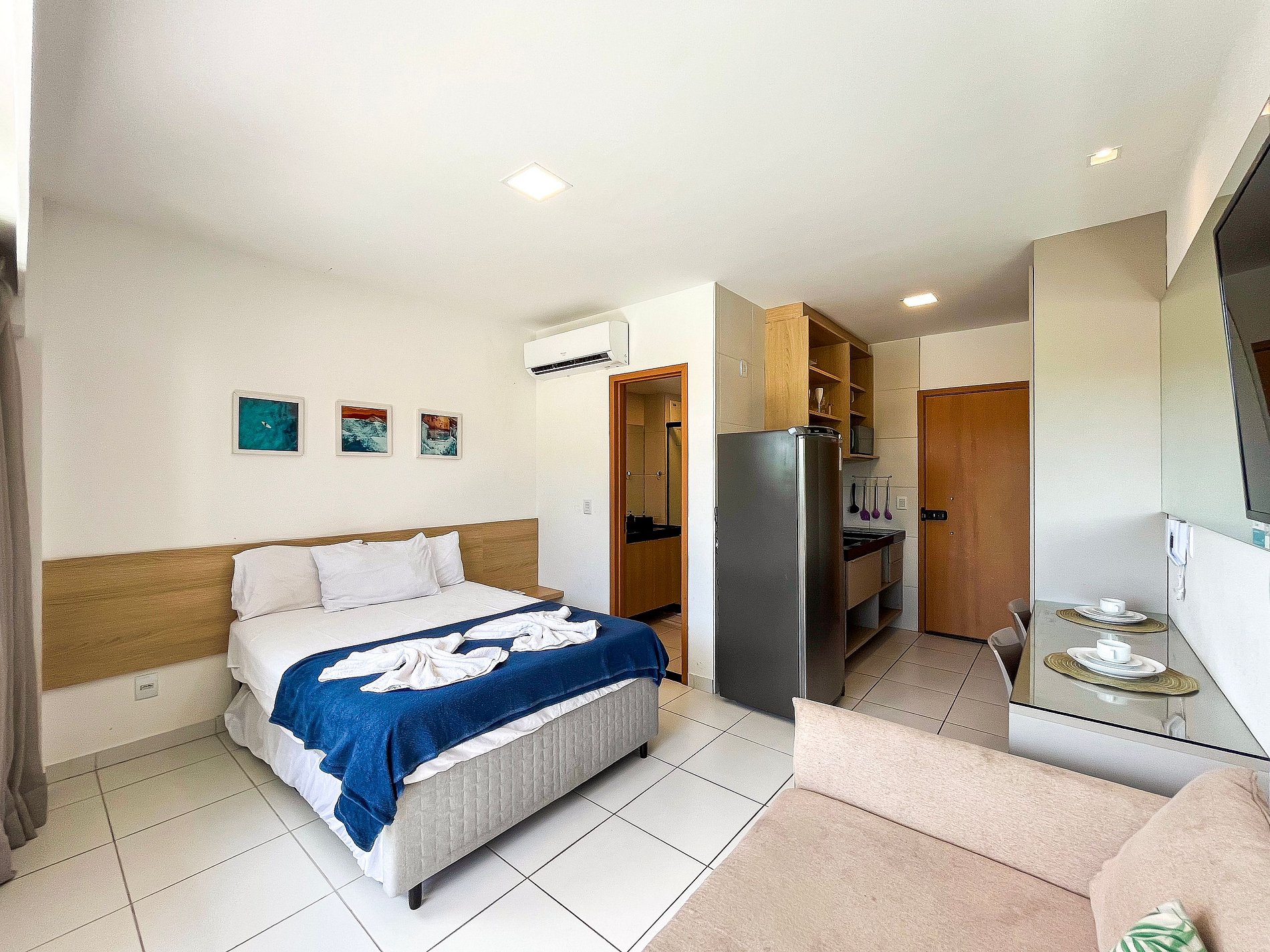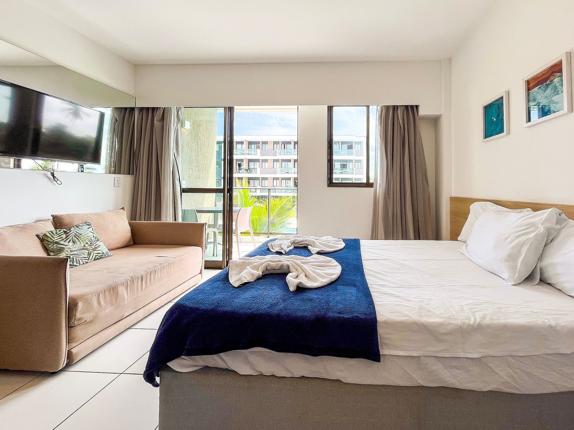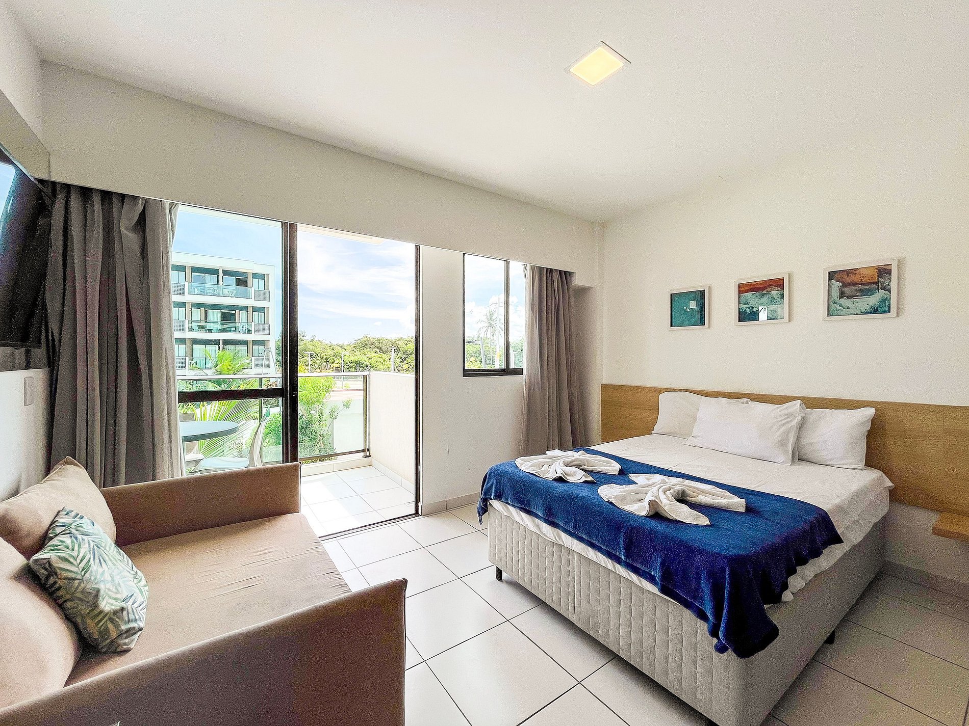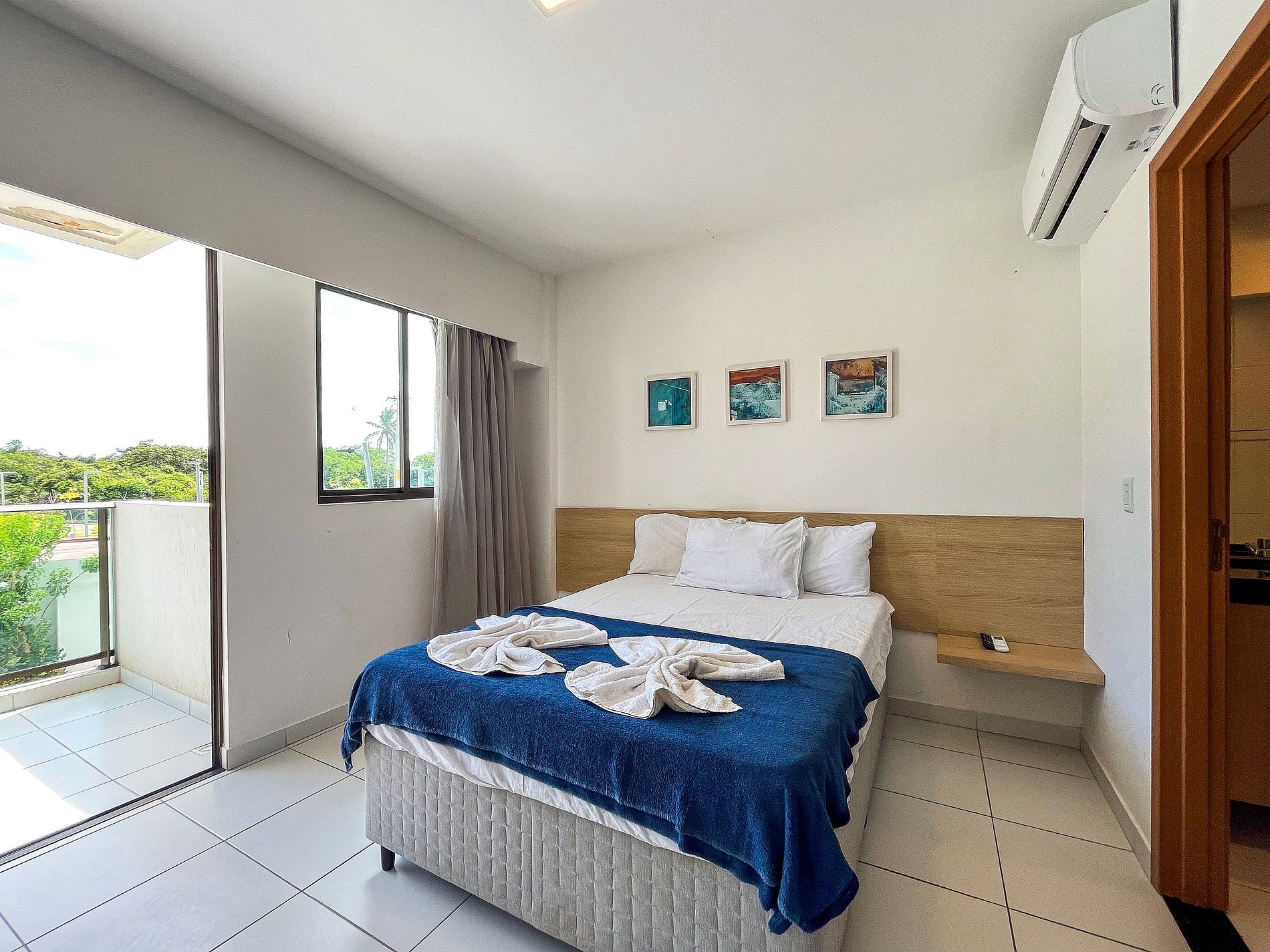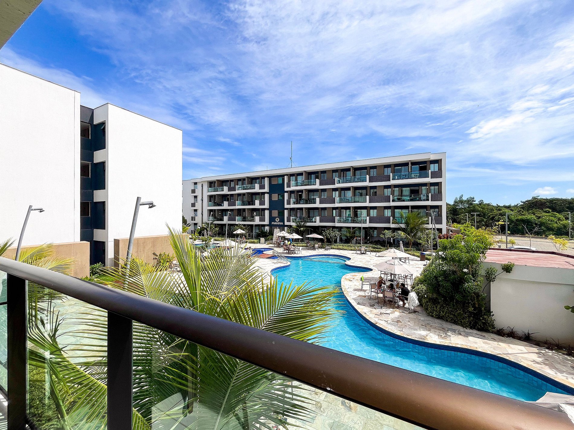 O apartamento de 30 m² acomoda até quatro pessoas com o conforto que você precisa: ar-condicionado, TV, Wi-Fi, varanda e uma cozinha compacta equipada, ideal para quem busca uma estadia funcional e agradável pertinho da praia. É o lugar ideal para quem deseja curtir a praia com conforto. Entre os principais atrativos estão piscina, jacuzzi, academia, restaurante, salão de jogos, campo de futebol, academia e espaços amplos para momentos de descanso e diversão.