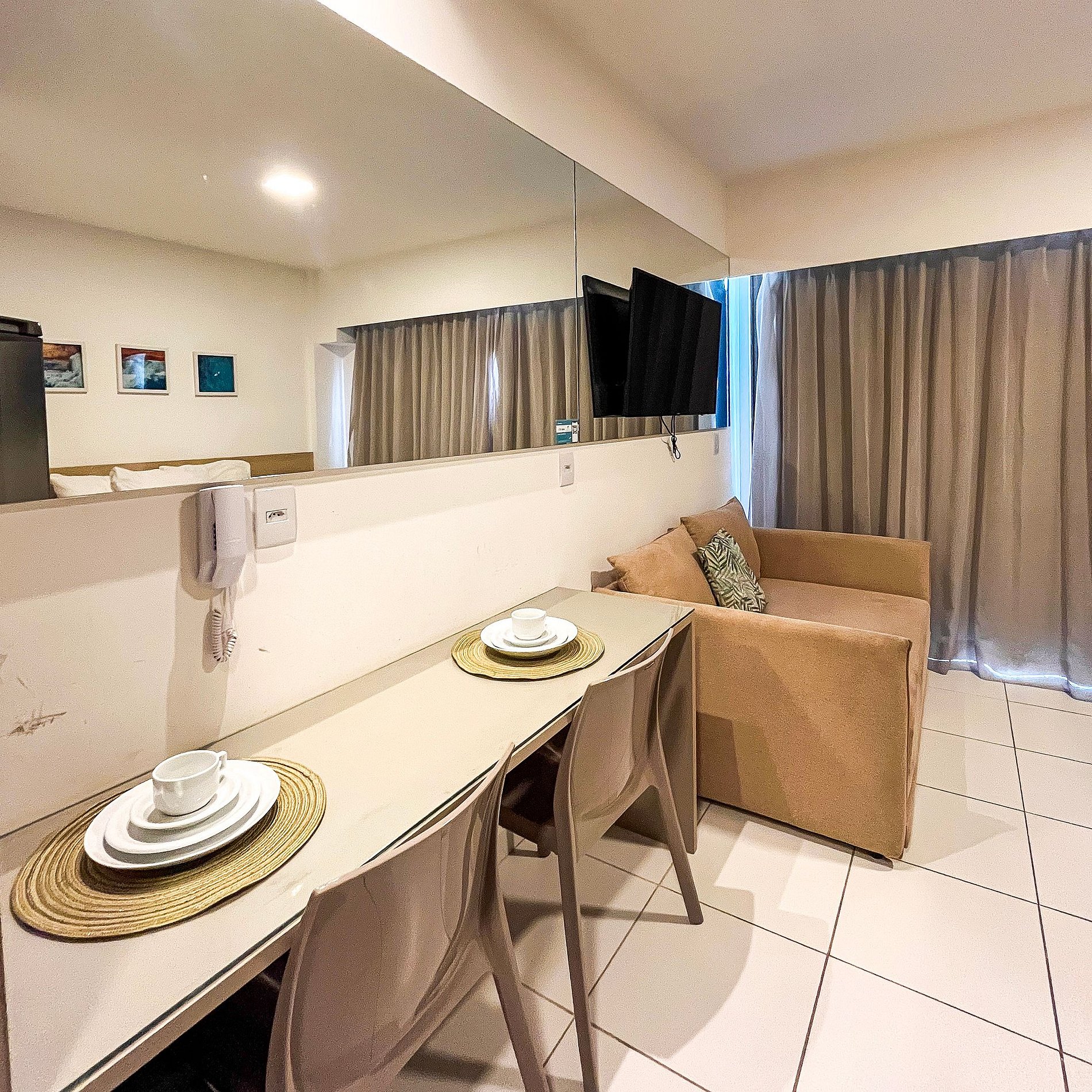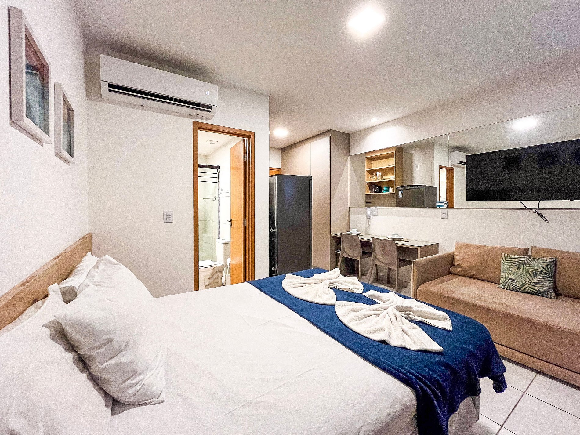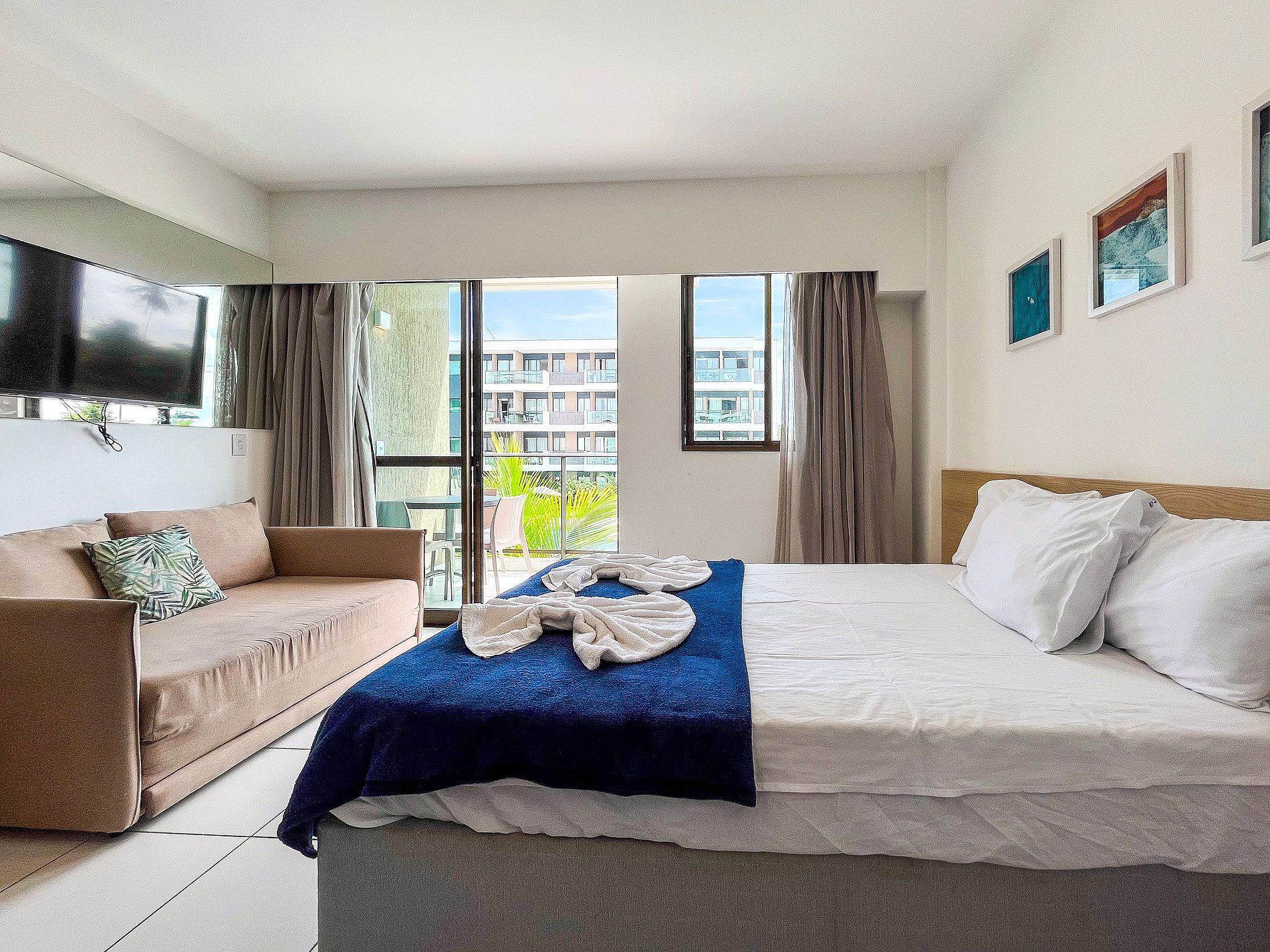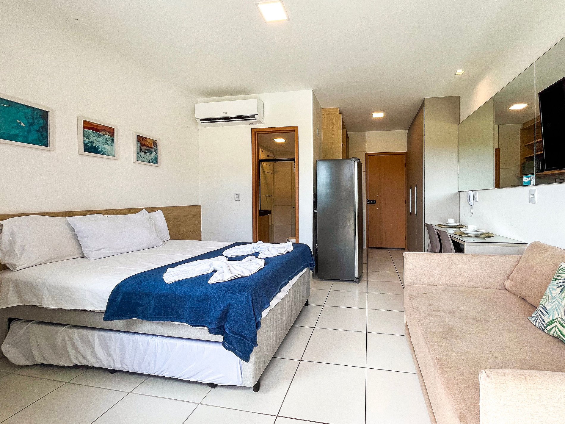 O apartamento de 30 m² acomoda até quatro pessoas com o conforto que você precisa: ar-condicionado, TV, Wi-Fi, varanda e uma cozinha compacta equipada, ideal para quem busca uma estadia funcional e agradável pertinho da praia. É o lugar ideal para quem deseja curtir a praia com conforto. Entre os principais atrativos estão piscina, jacuzzi, academia, restaurante, salão de jogos, campo de futebol, academia e espaços amplos para momentos de descanso e diversão.