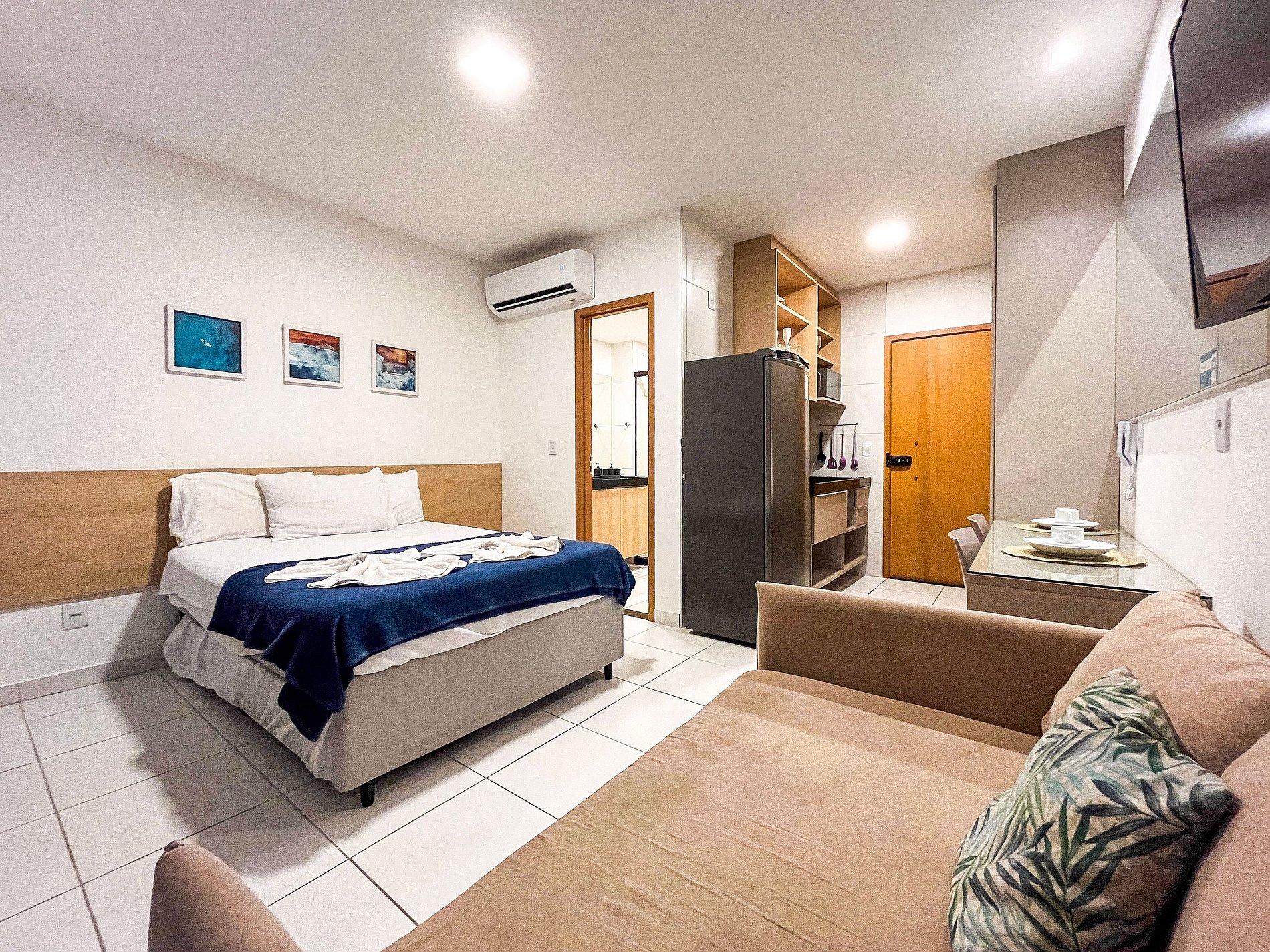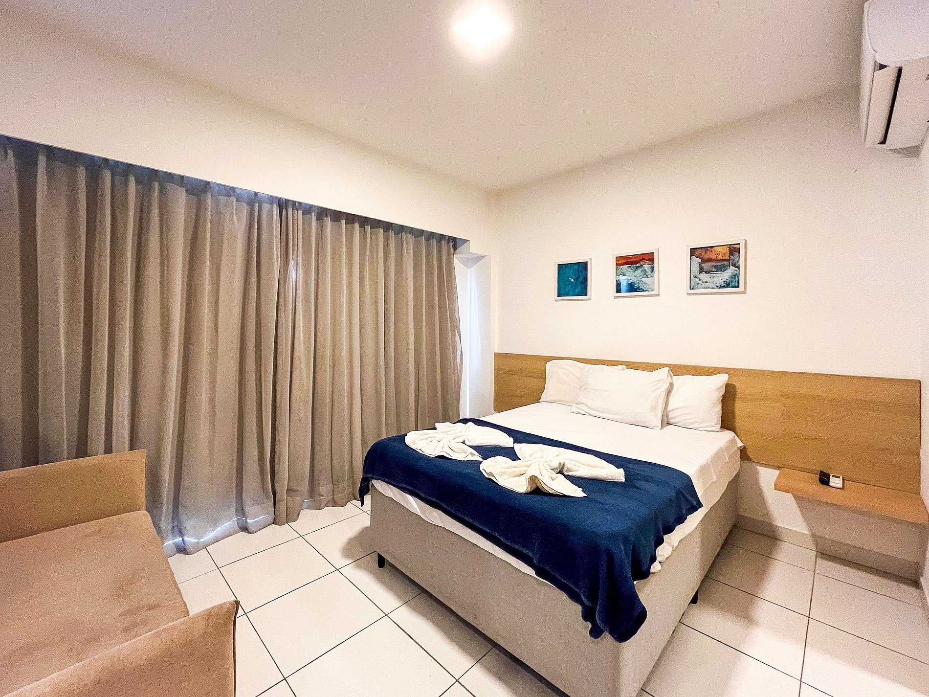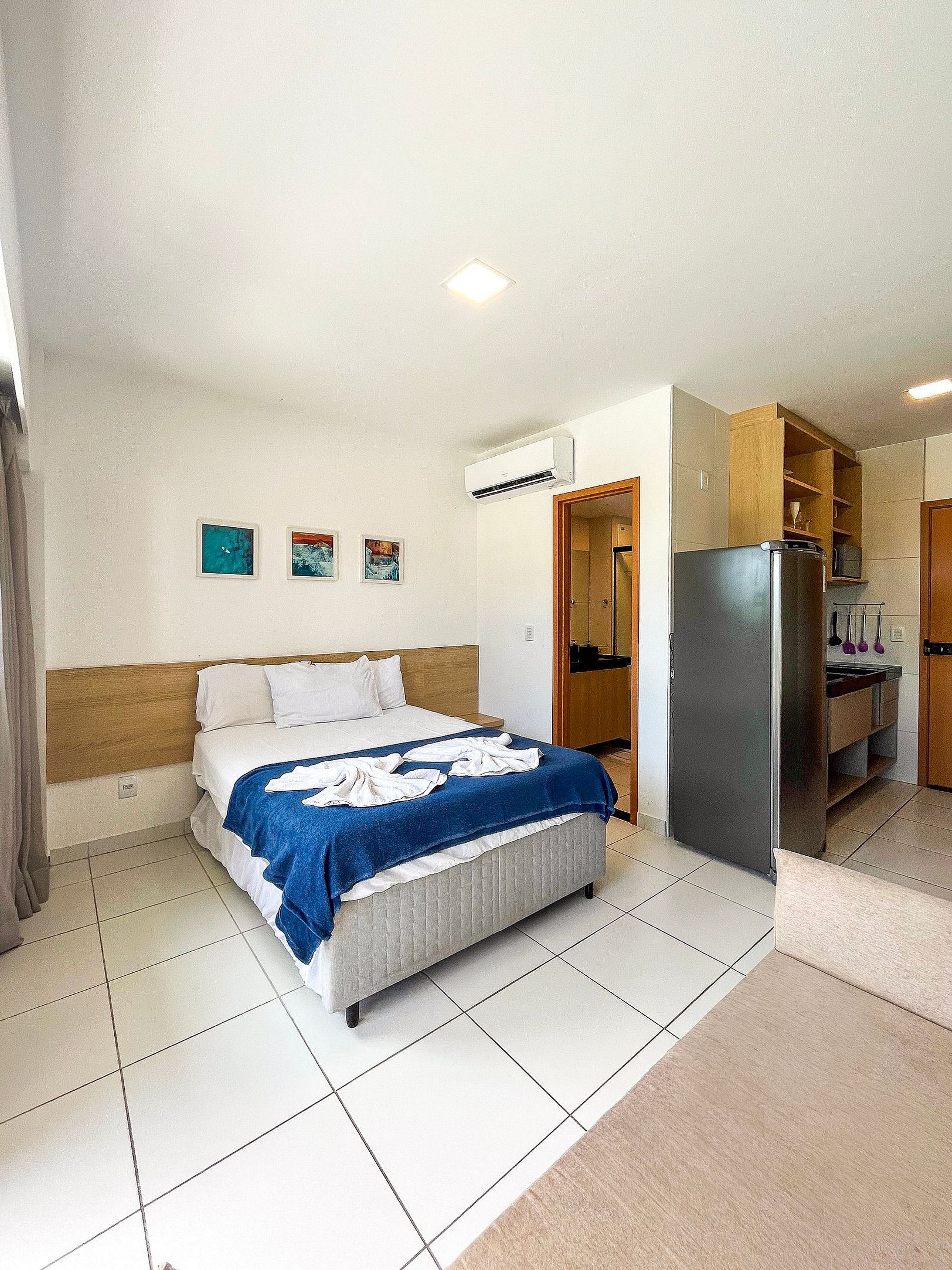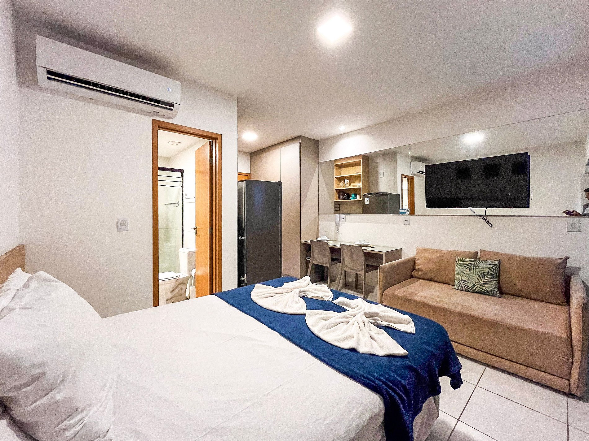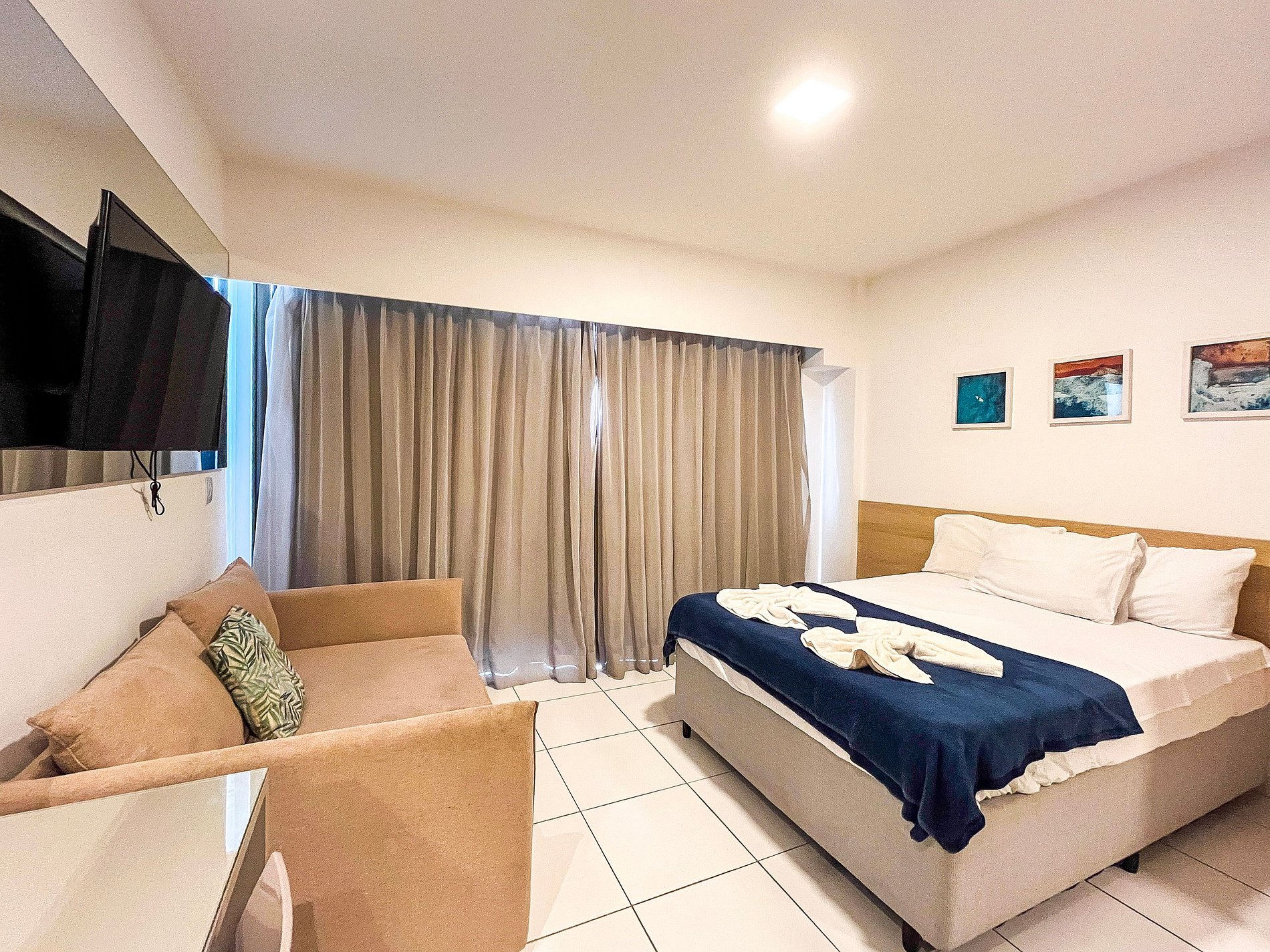O apartamento de 30 m² acomoda até quatro pessoas com o conforto que você precisa: ar-condicionado, TV, Wi-Fi, varanda e uma cozinha compacta equipada, ideal para quem busca uma estadia funcional e agradável pertinho da praia. É o lugar ideal para quem deseja curtir a praia com conforto. Entre os principais atrativos estão piscina, jacuzzi, academia, restaurante, salão de jogos, campo de futebol, academia e espaços amplos para momentos de descanso e diversão.