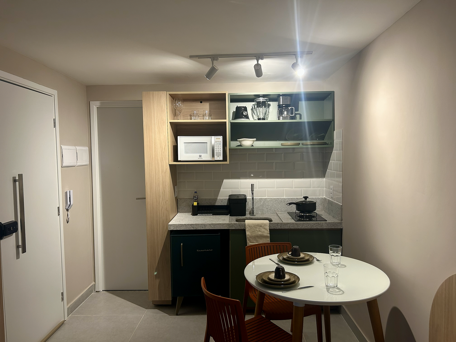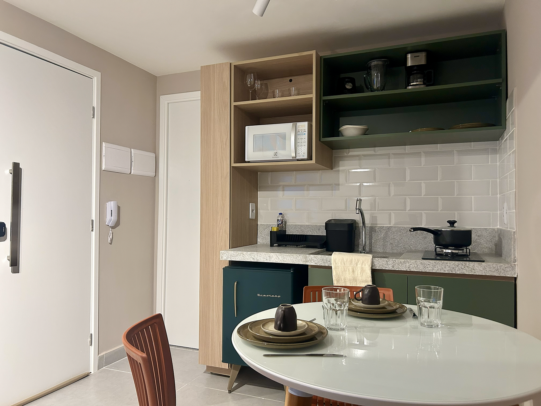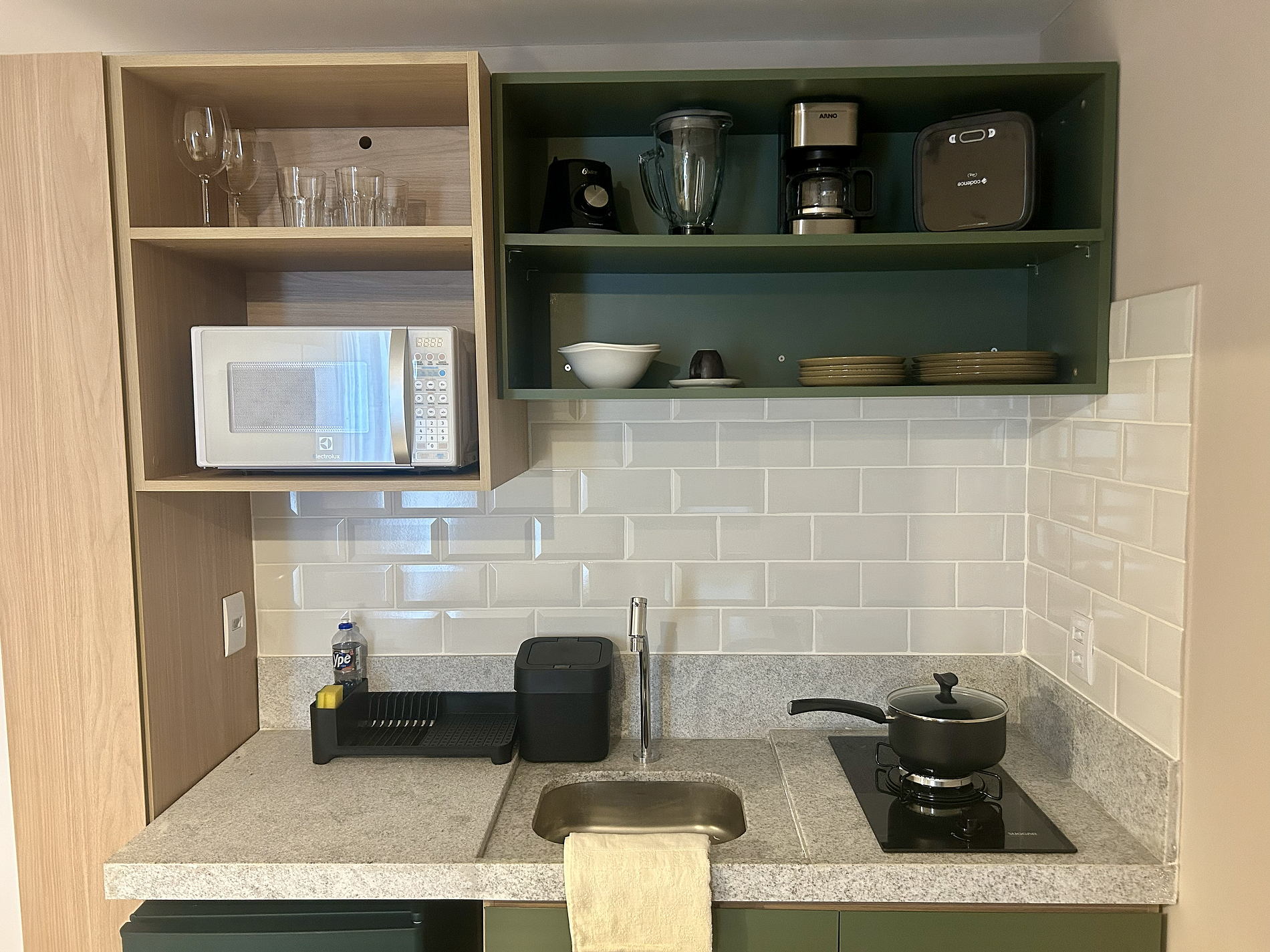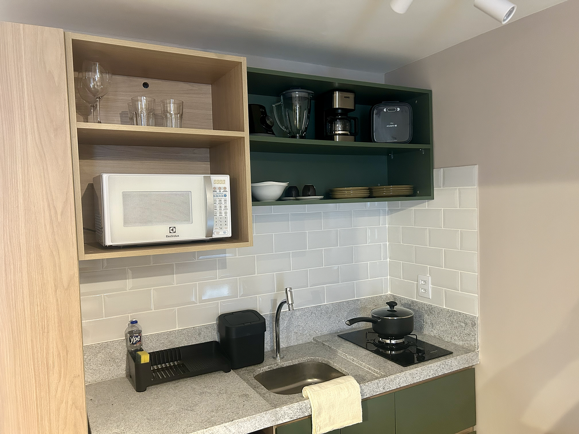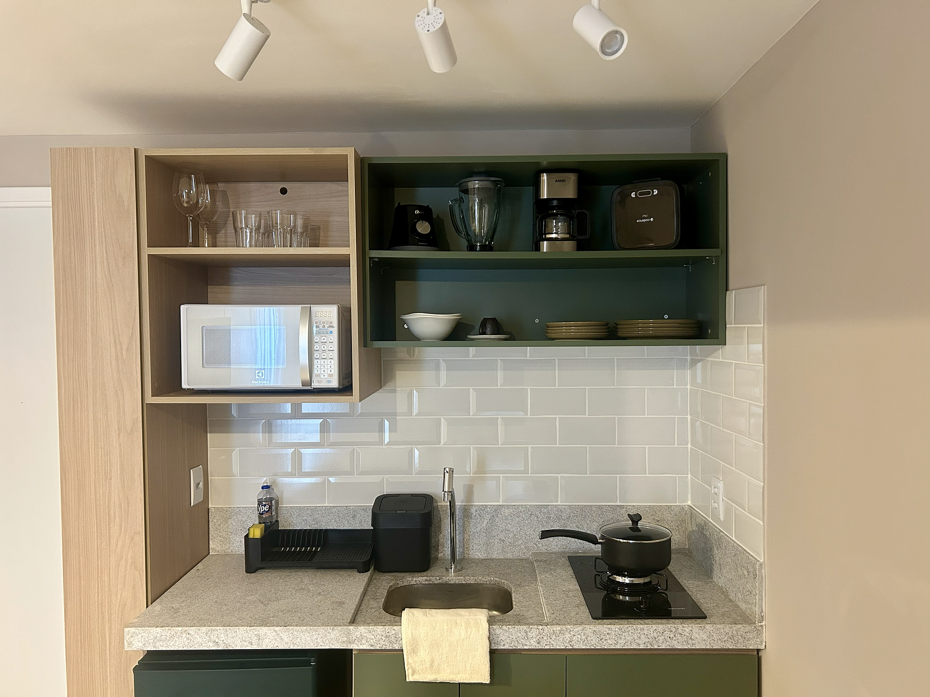 • Cozinha compacta e equipada, com itens essenciais para o dia a dia