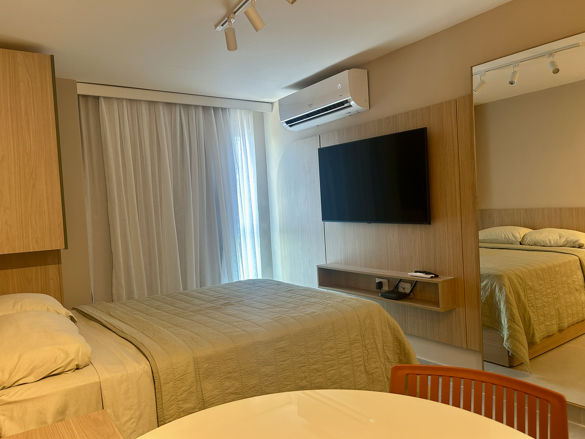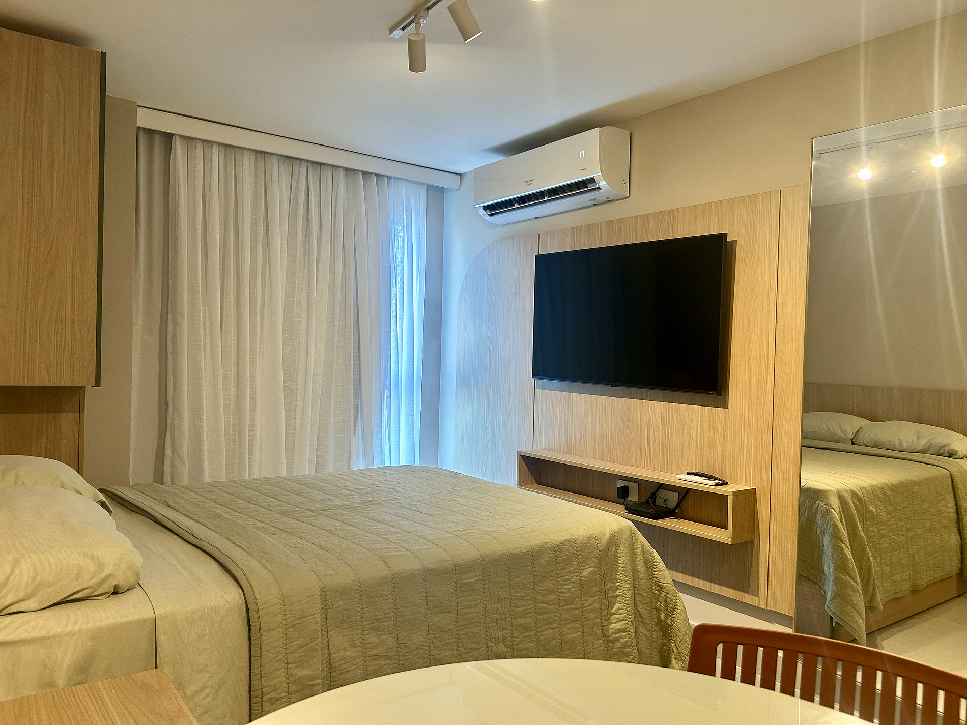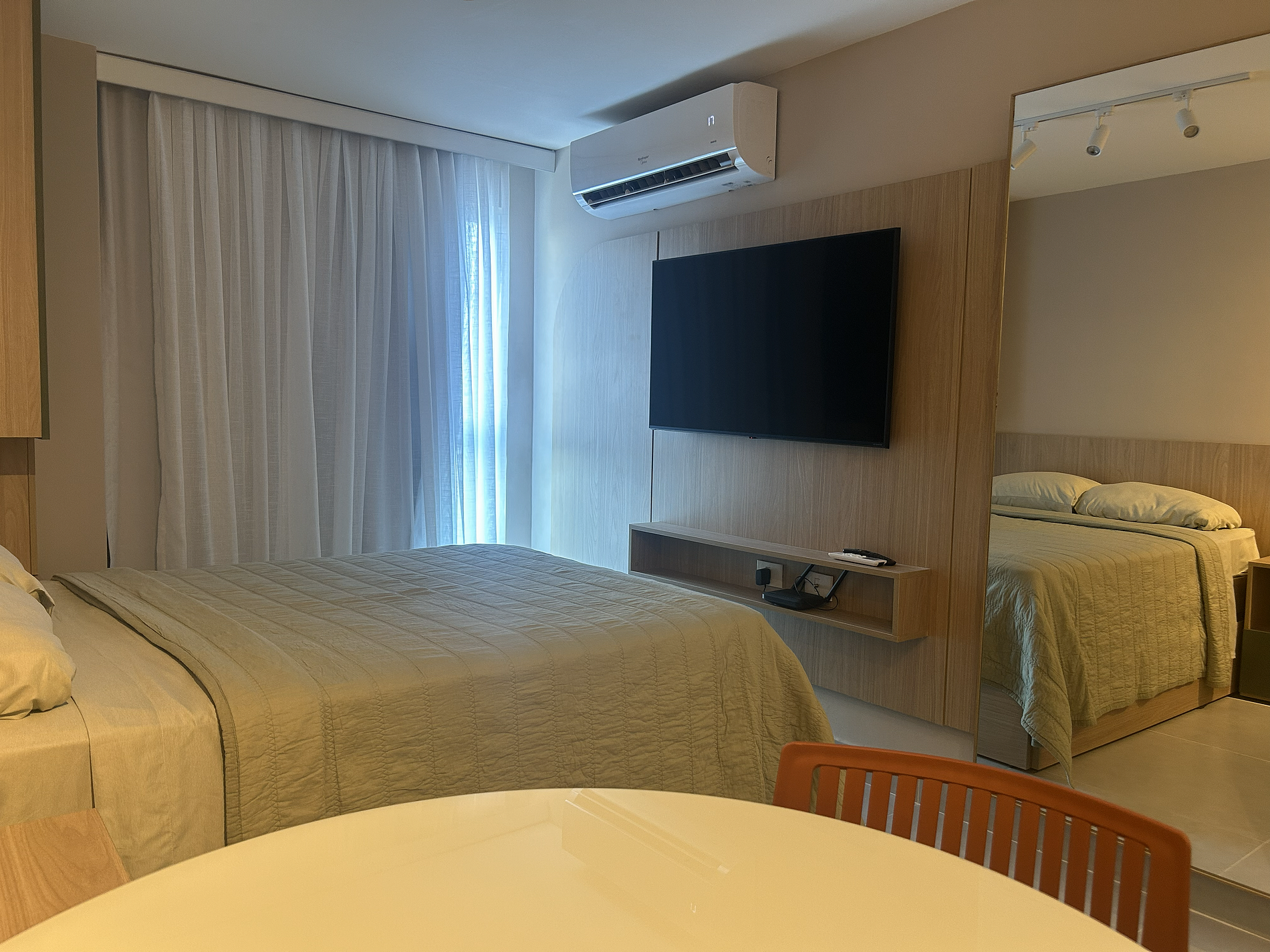 Estúdio compacto de 18 m² no Condomínio Ocean Blue, funcional e bem planejado, com ar-condicionado, Wi-Fi, TV e cozinha equipada. O condomínio oferece rooftop com piscina, sauna e excelente localização, com fácil acesso ao centro, praias, bares e restaurantes de Porto de Galinhas.
