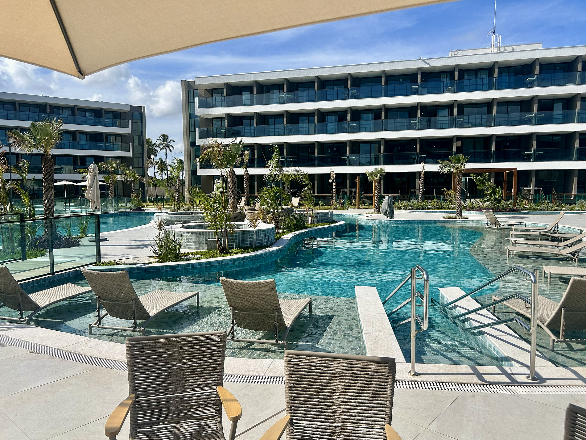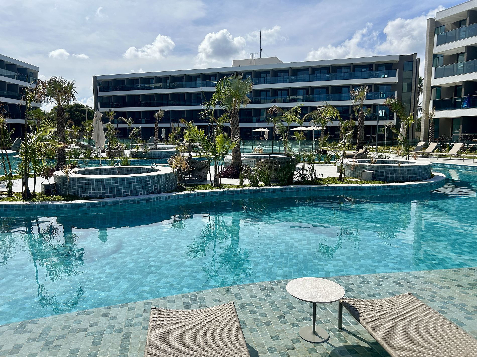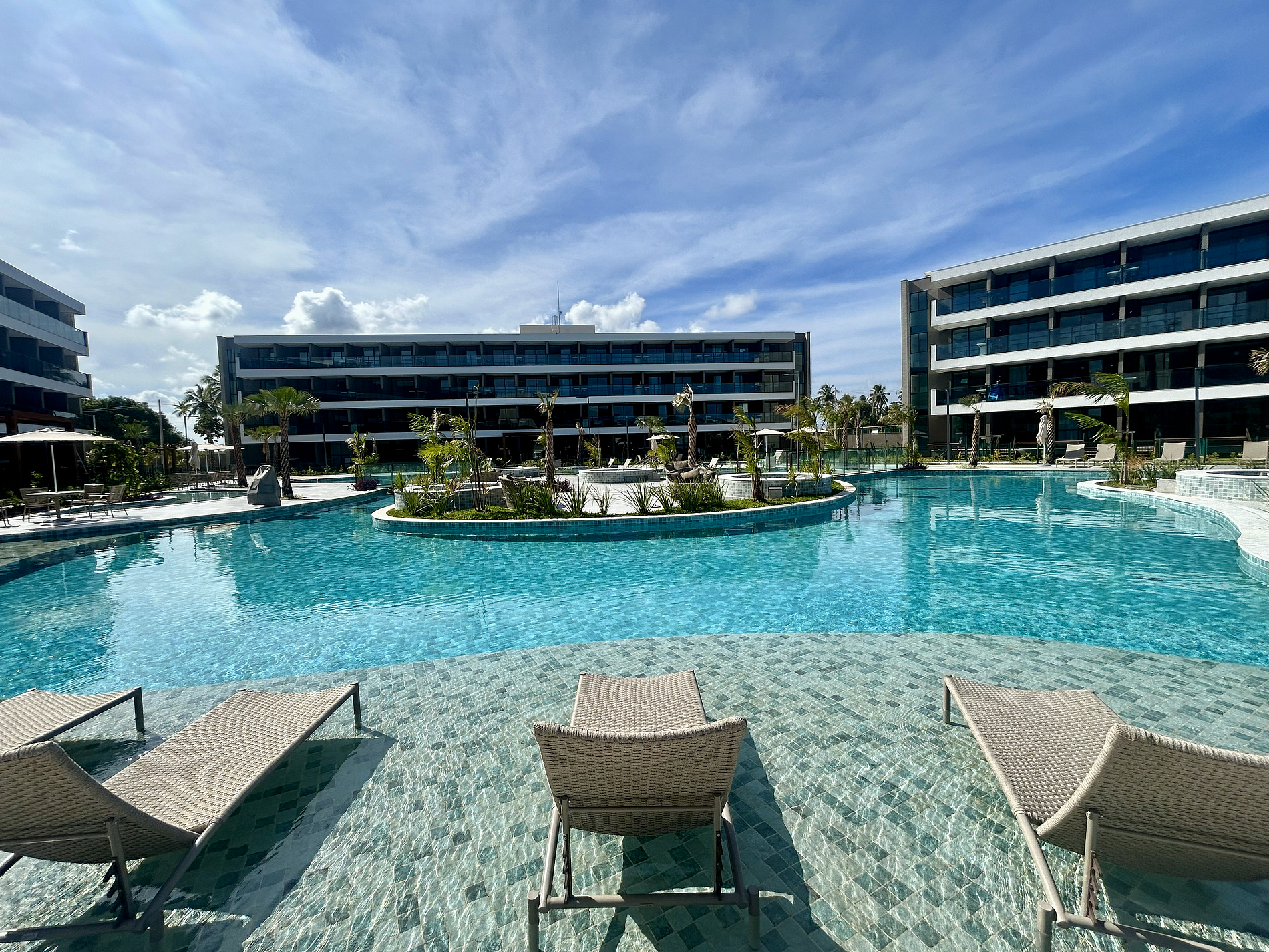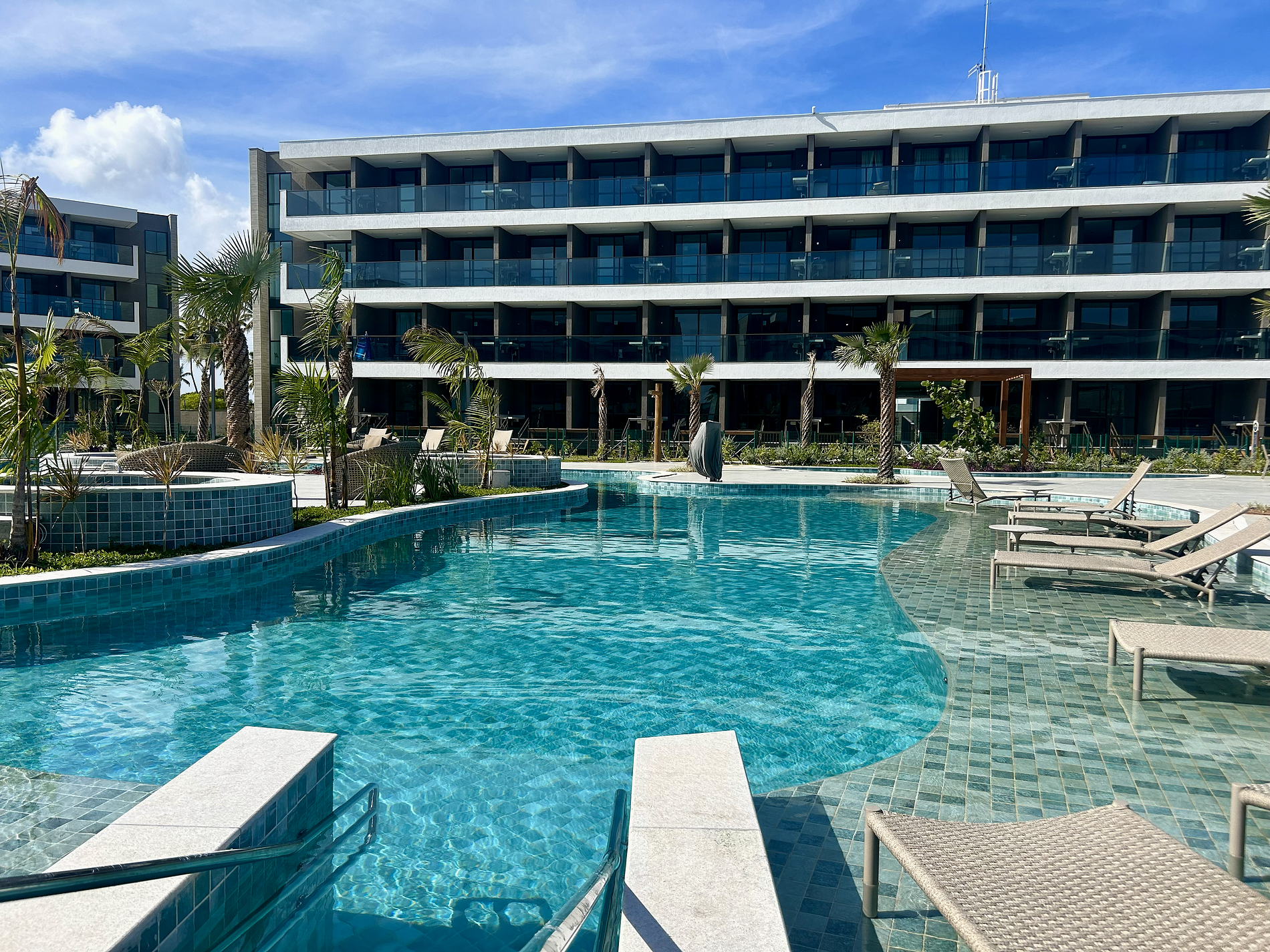 Área de lazer com piscinas para adultos e crianças, jacuzzi, espreguiçadeiras, playground, espaço kids, academia, jardins, áreas de convivência, loja de conveniência, restaurante, acesso à praia com cadeiras, ombrelones e recepção.