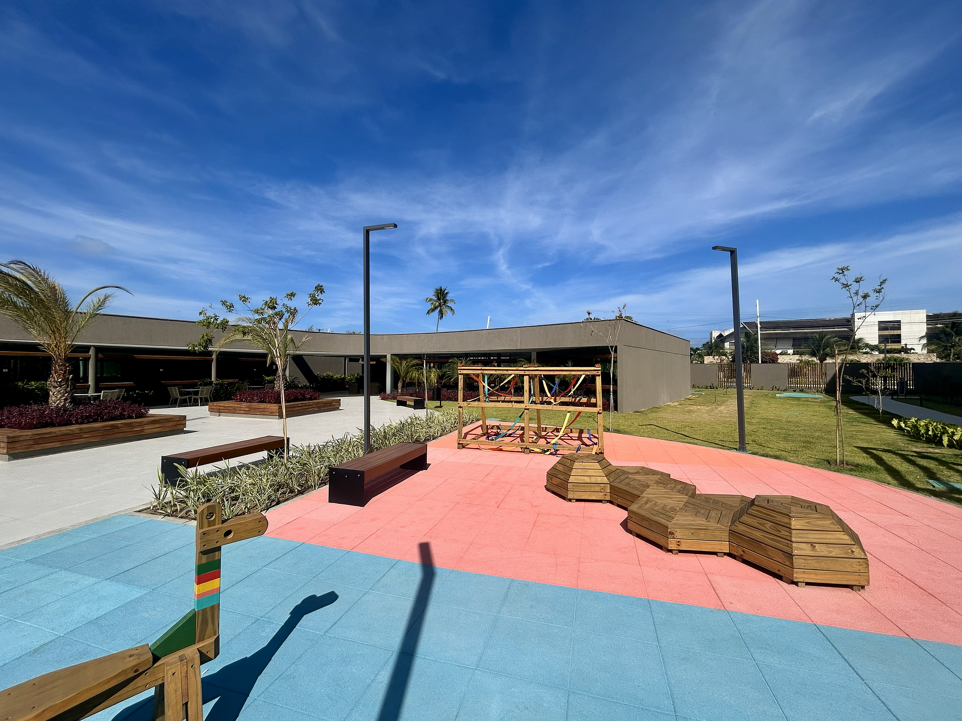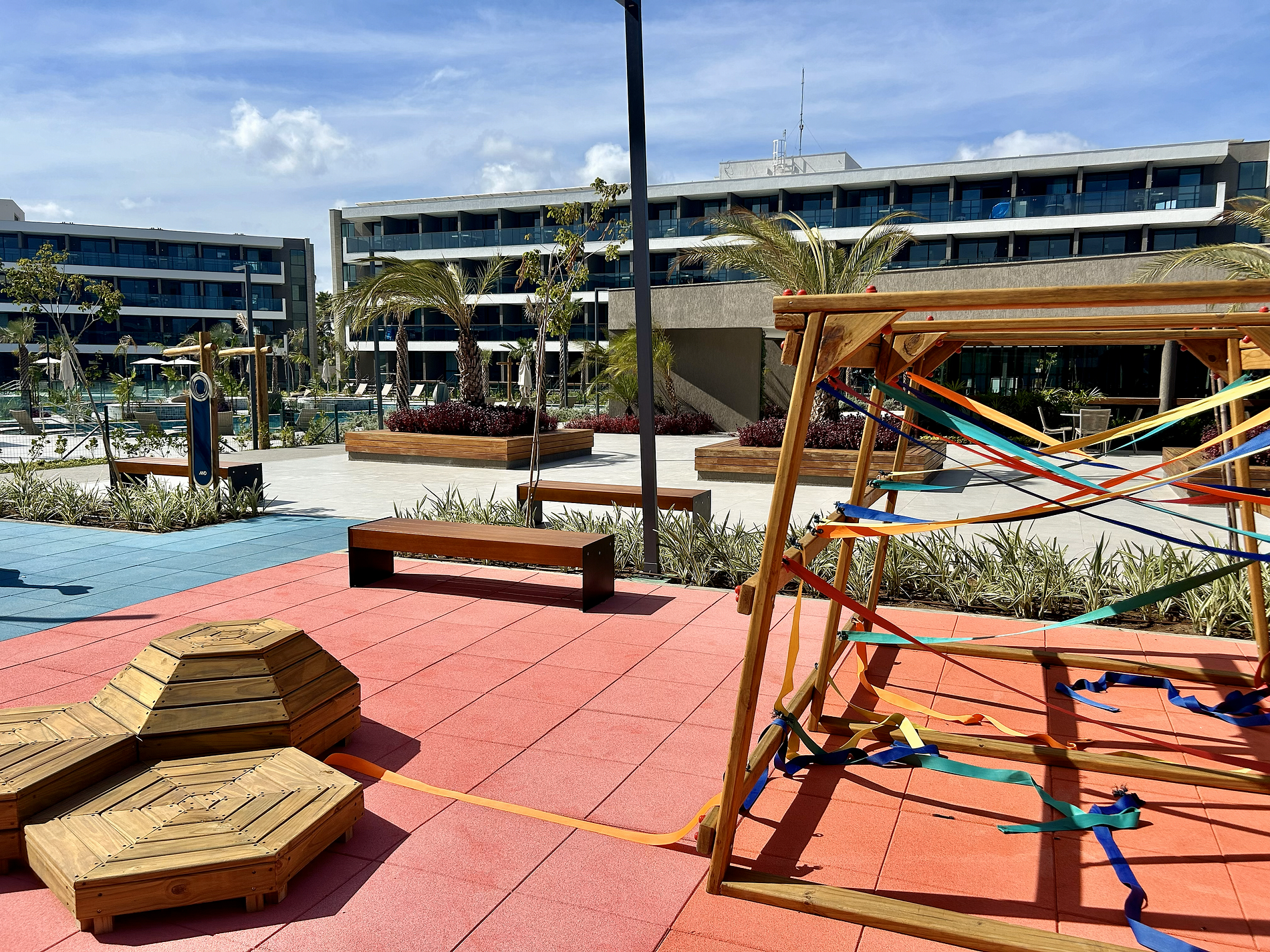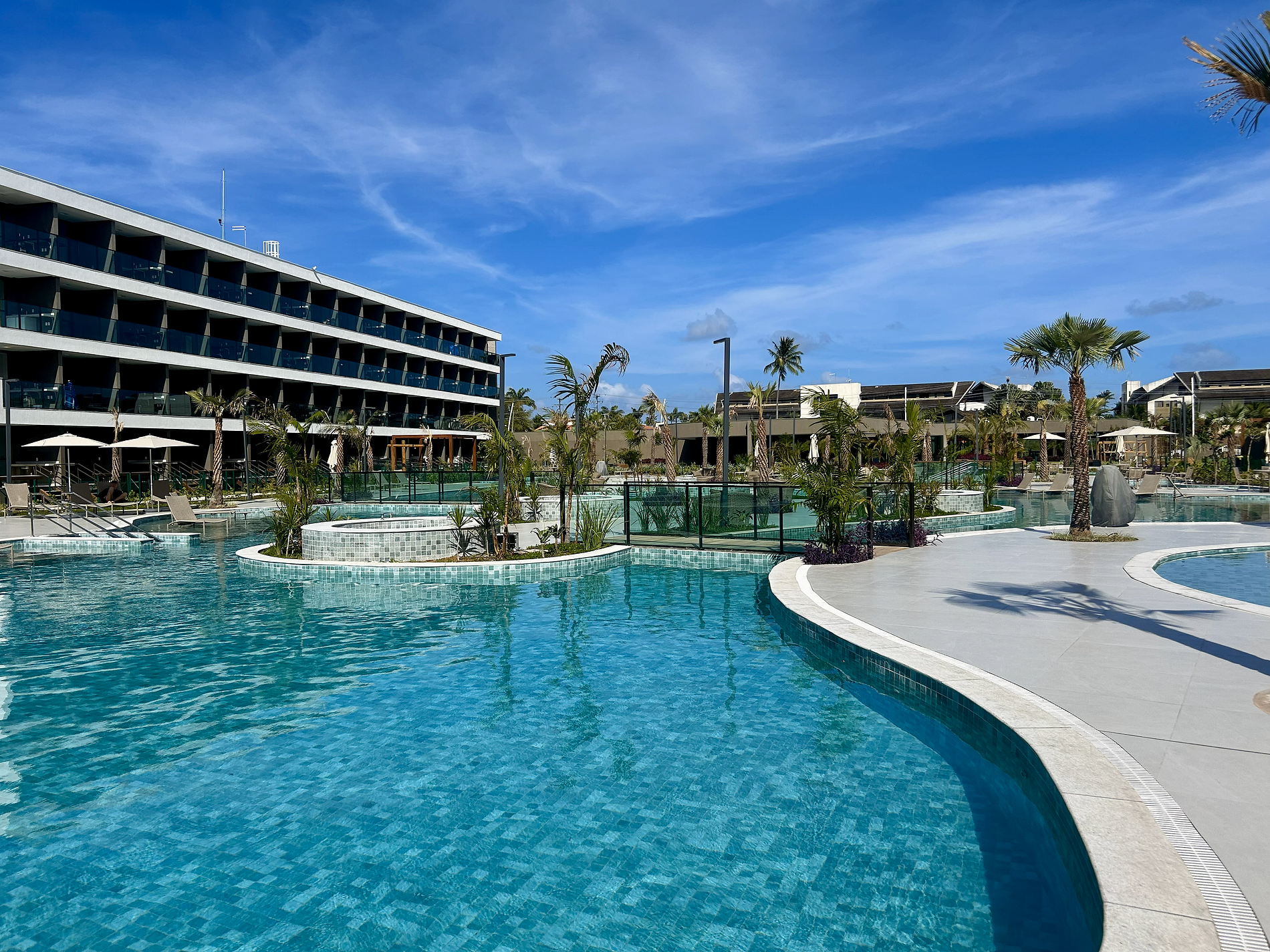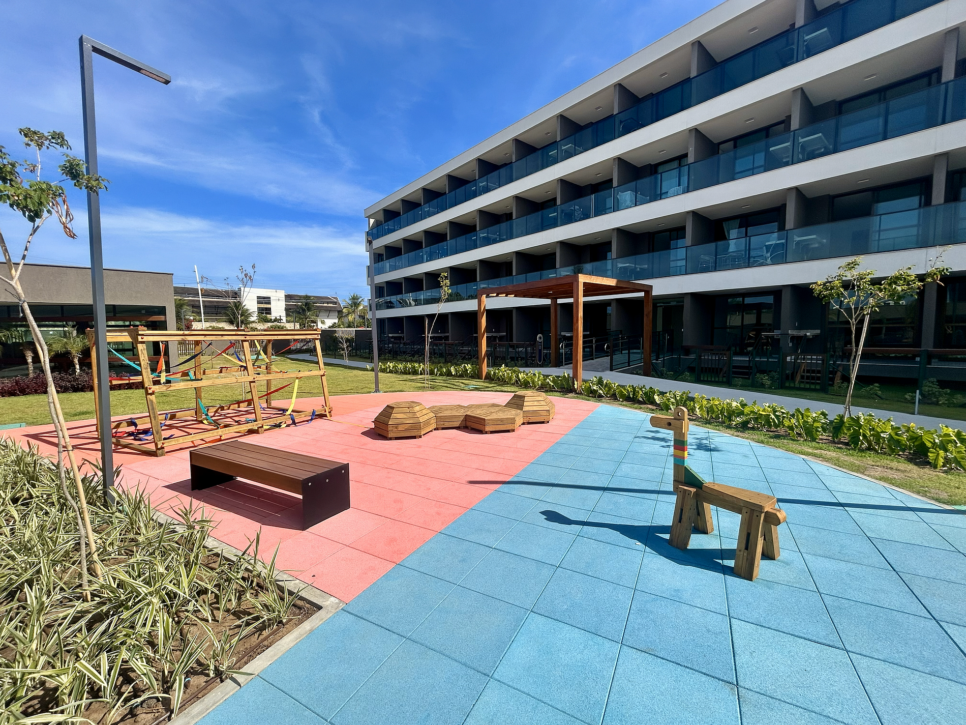 Área de lazer com piscinas para adultos e crianças, jacuzzi, espreguiçadeiras, playground, espaço kids, academia, jardins, áreas de convivência, loja de conveniência, restaurante, acesso à praia com cadeiras, ombrelones e recepção.
