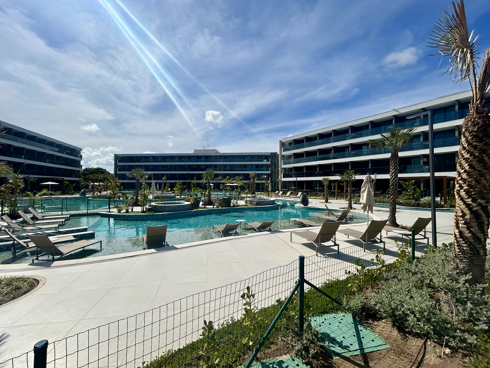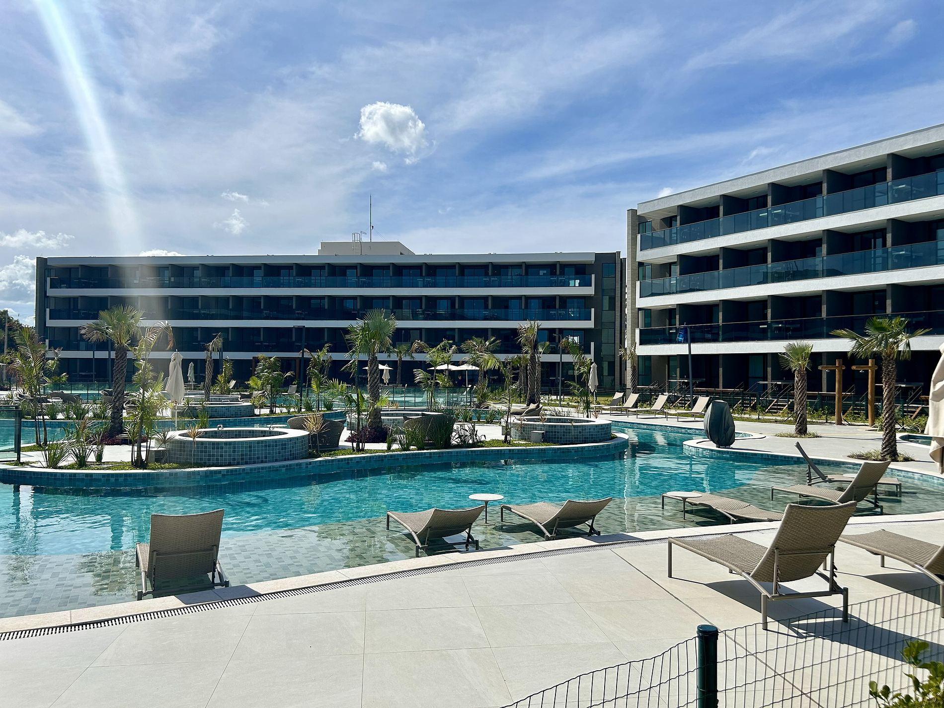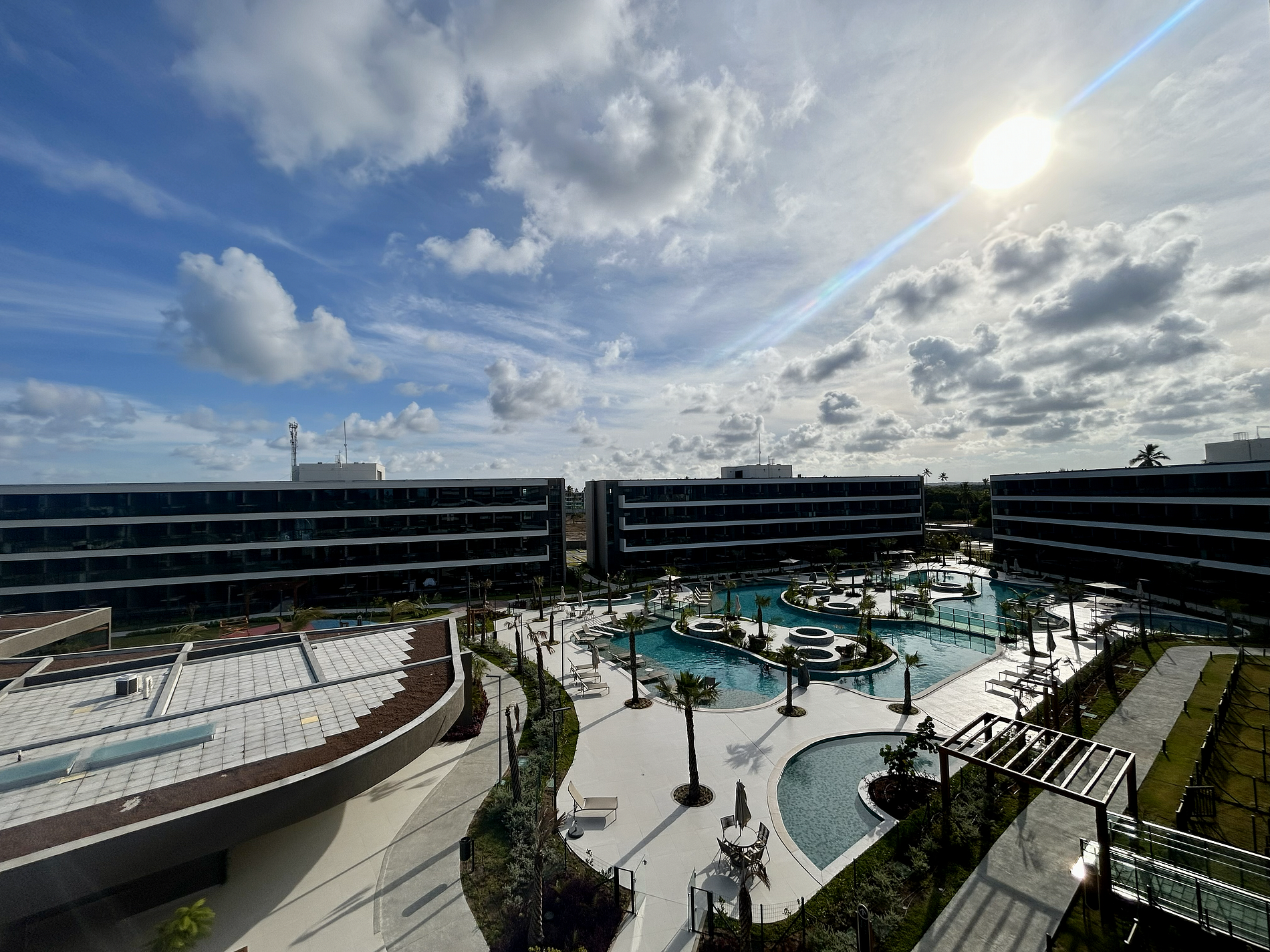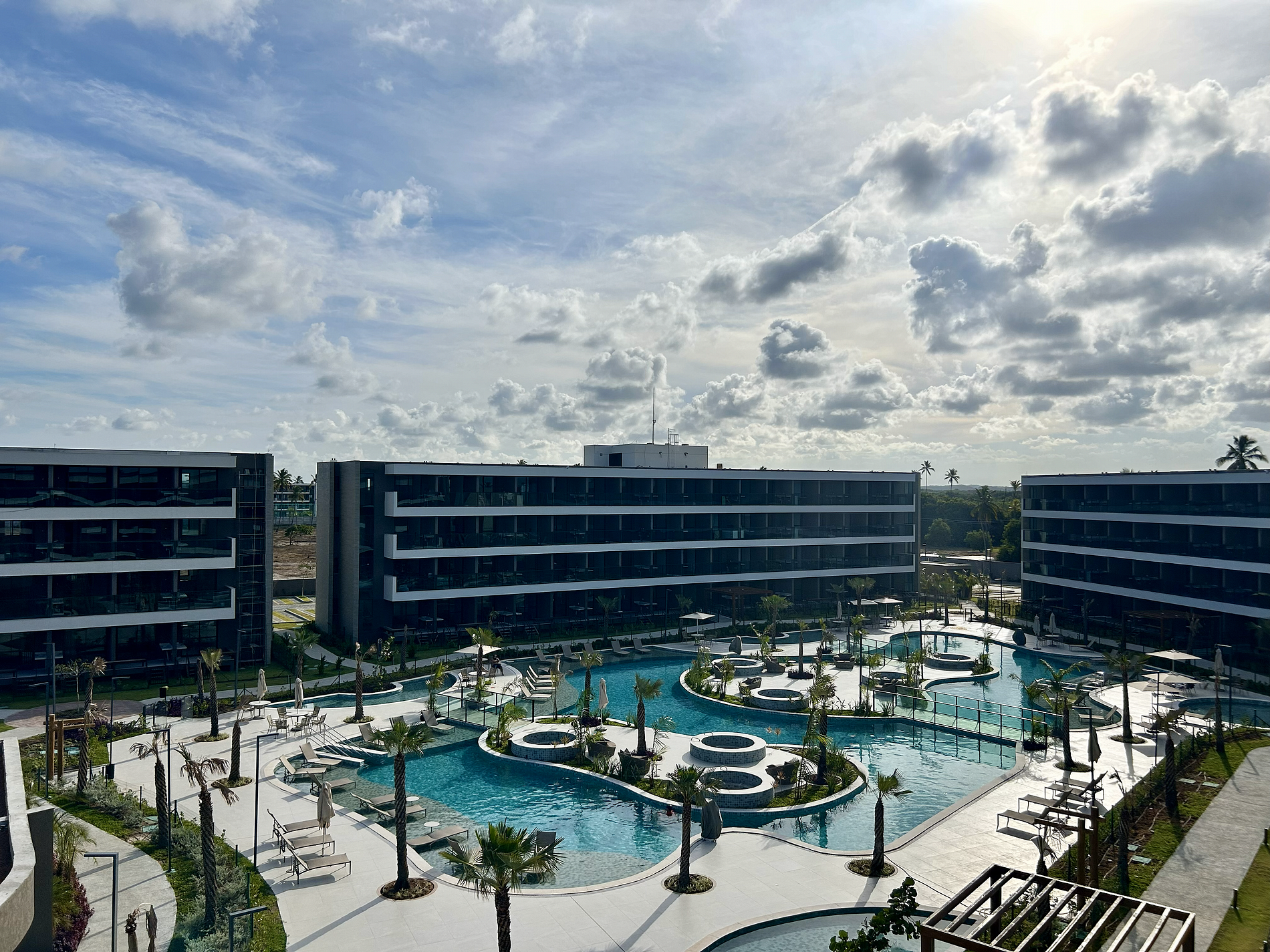 Área de lazer com piscinas para adultos e crianças, jacuzzi, espreguiçadeiras, playground, espaço kids, academia, jardins, áreas de convivência, loja de conveniência, restaurante, acesso à praia com cadeiras, ombrelones e recepção.