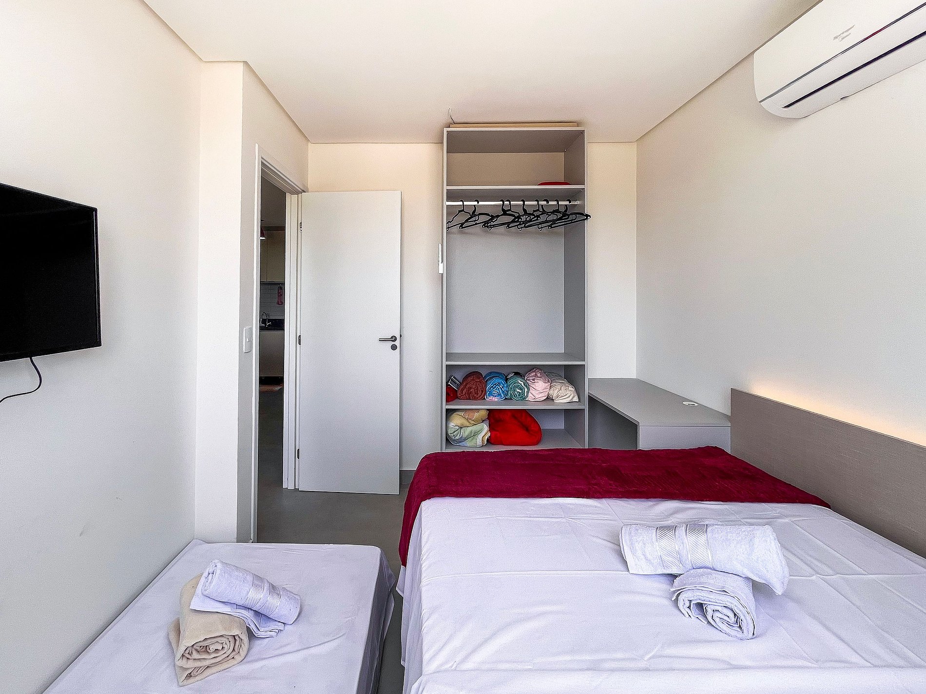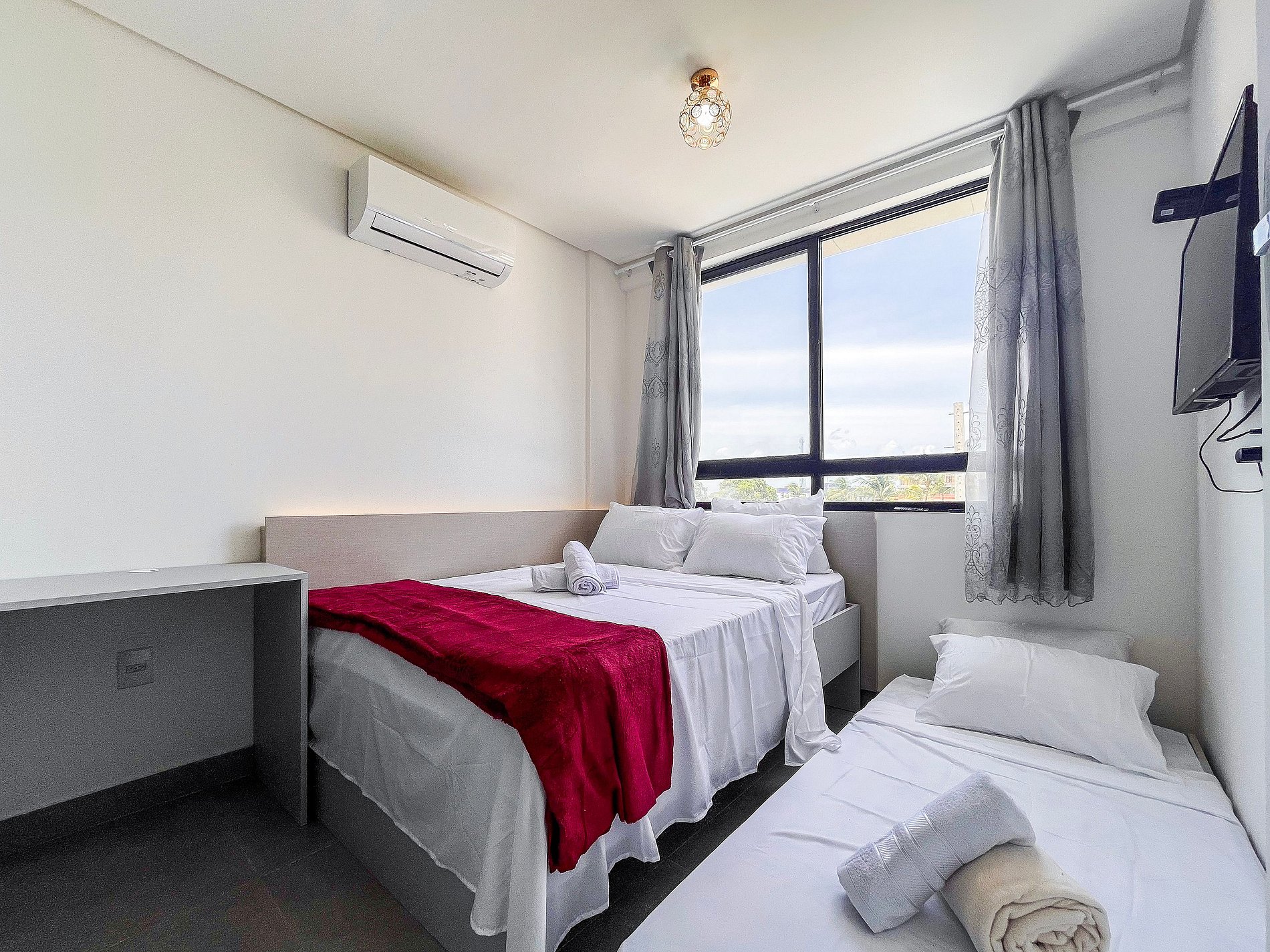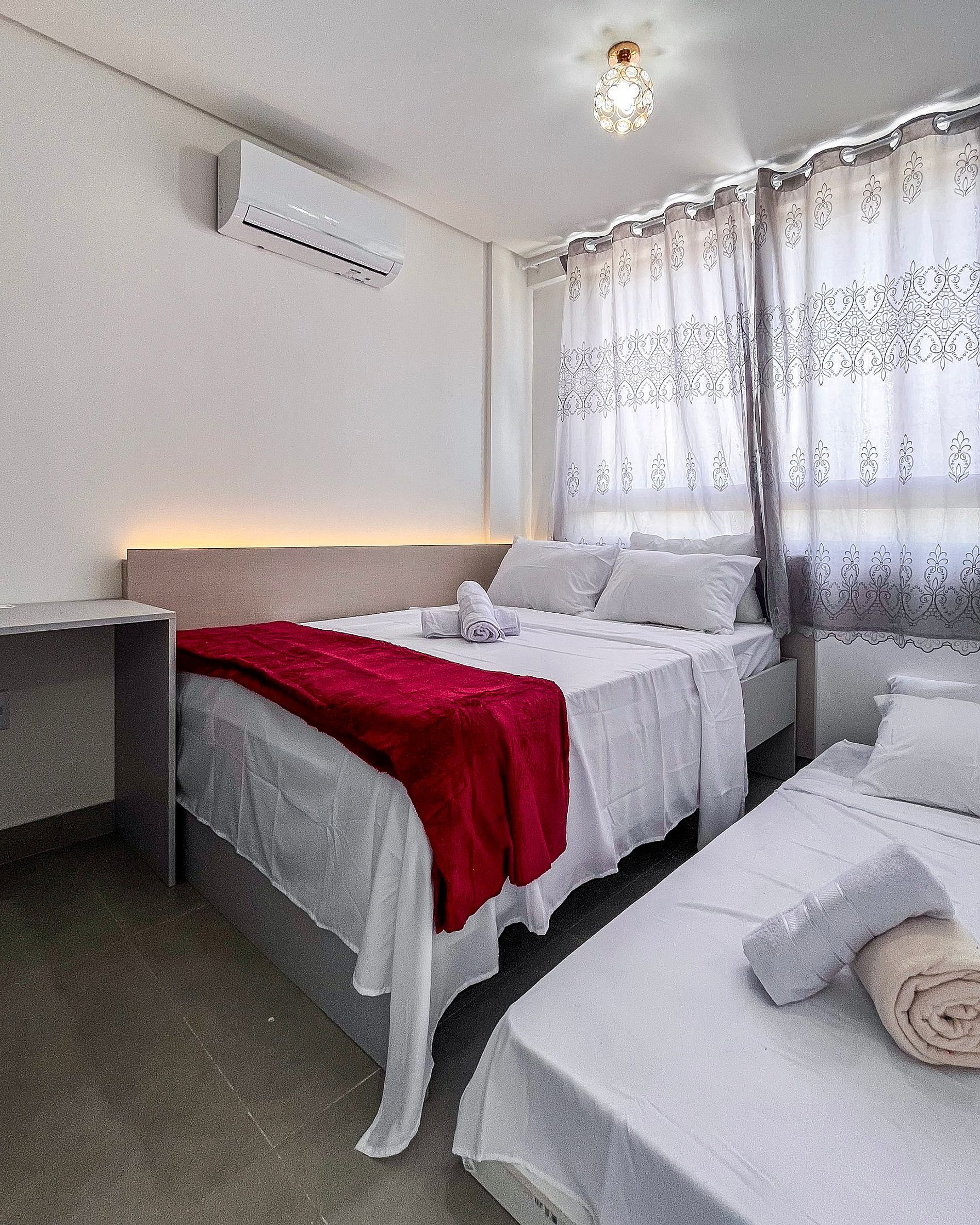 Todos os quartos possuem ar condicionado e também há na sala de estar. A composição dos quartos é de:
