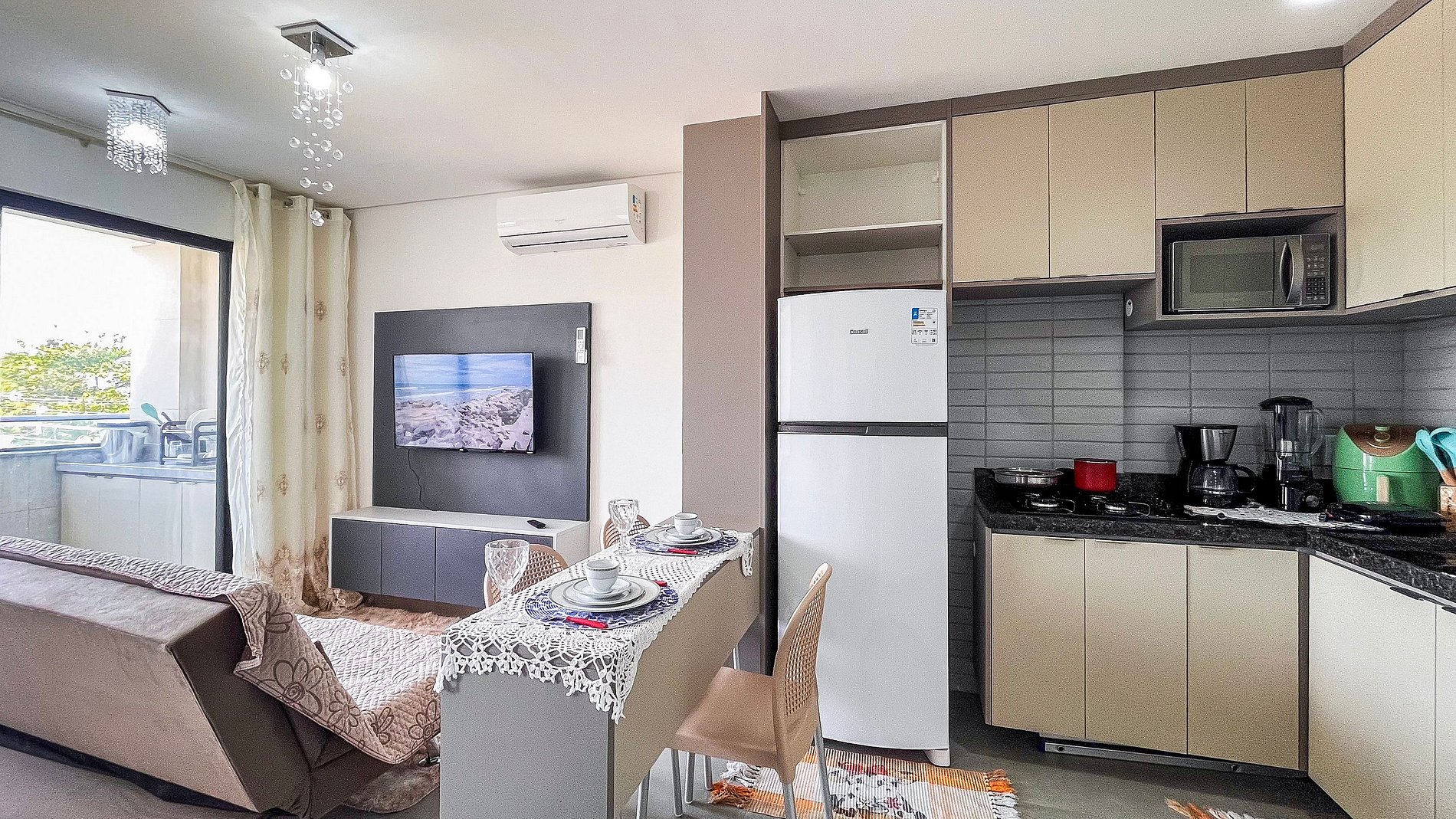 A cozinha está totalmente equipada com: forno, cooktop, geladeira com freezer, air fryer, talheres, pratos, microondas, sanduicheira, panelas, frigideiras.