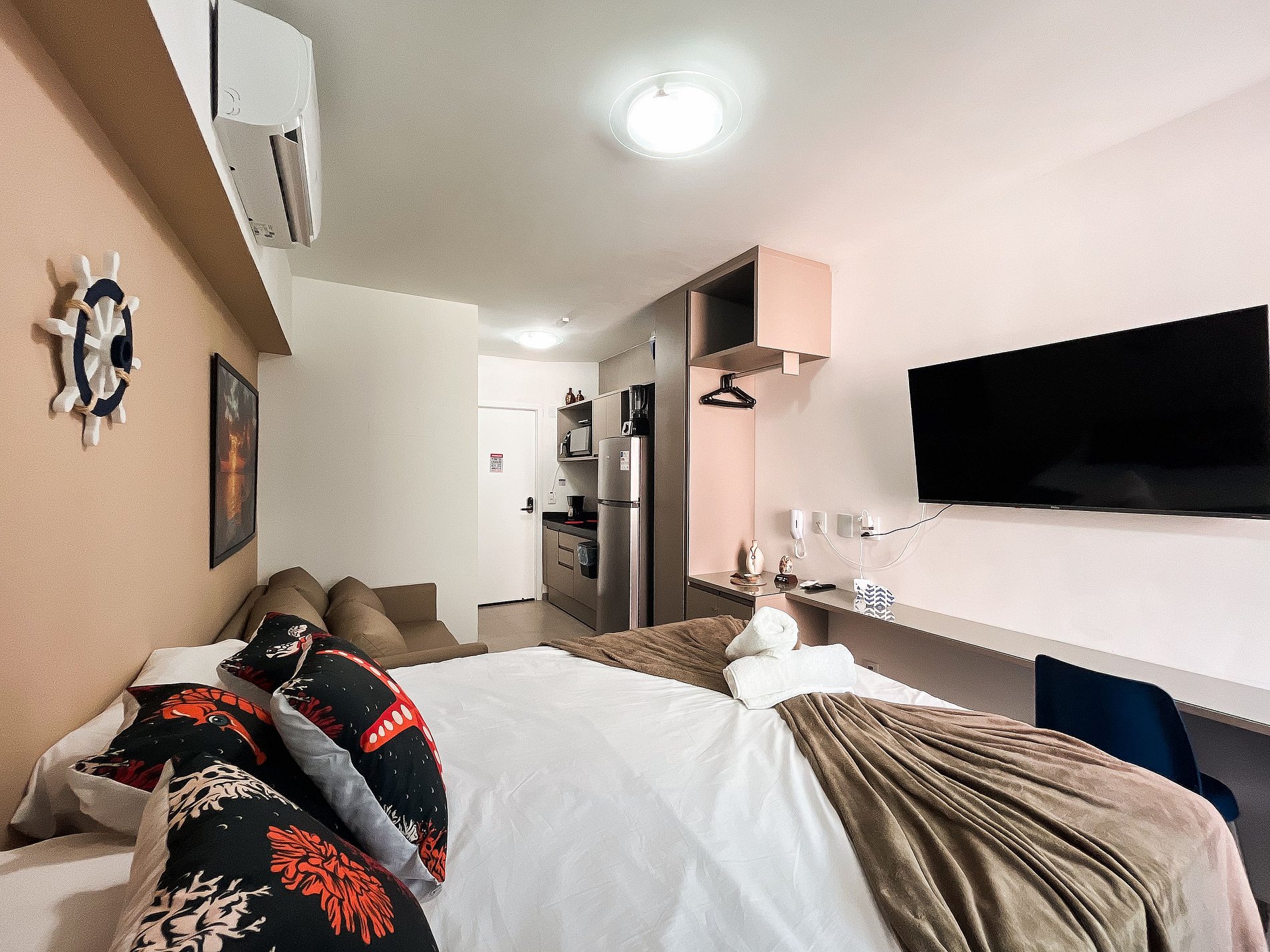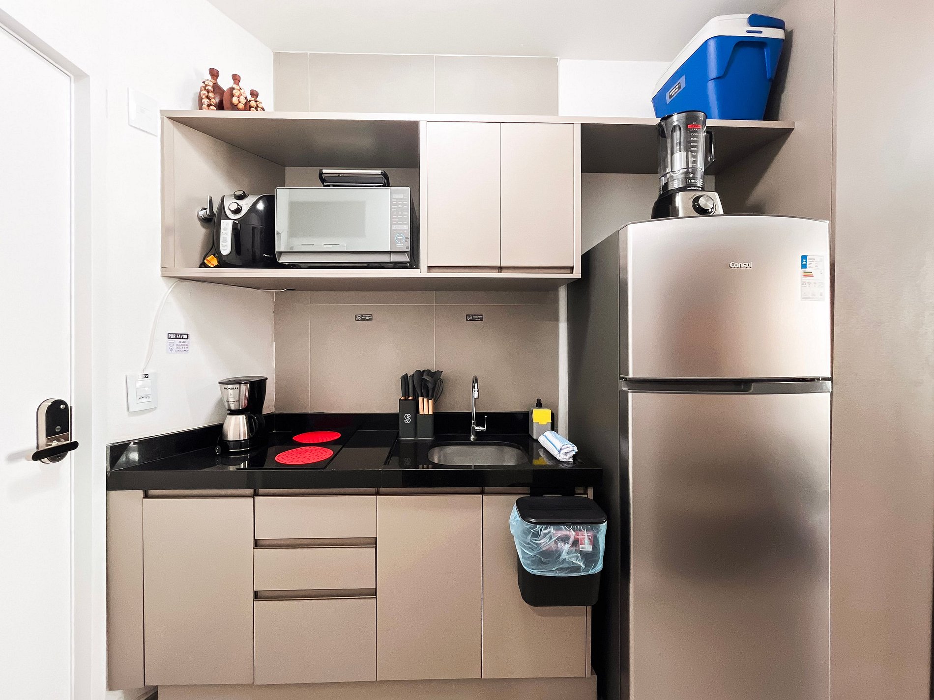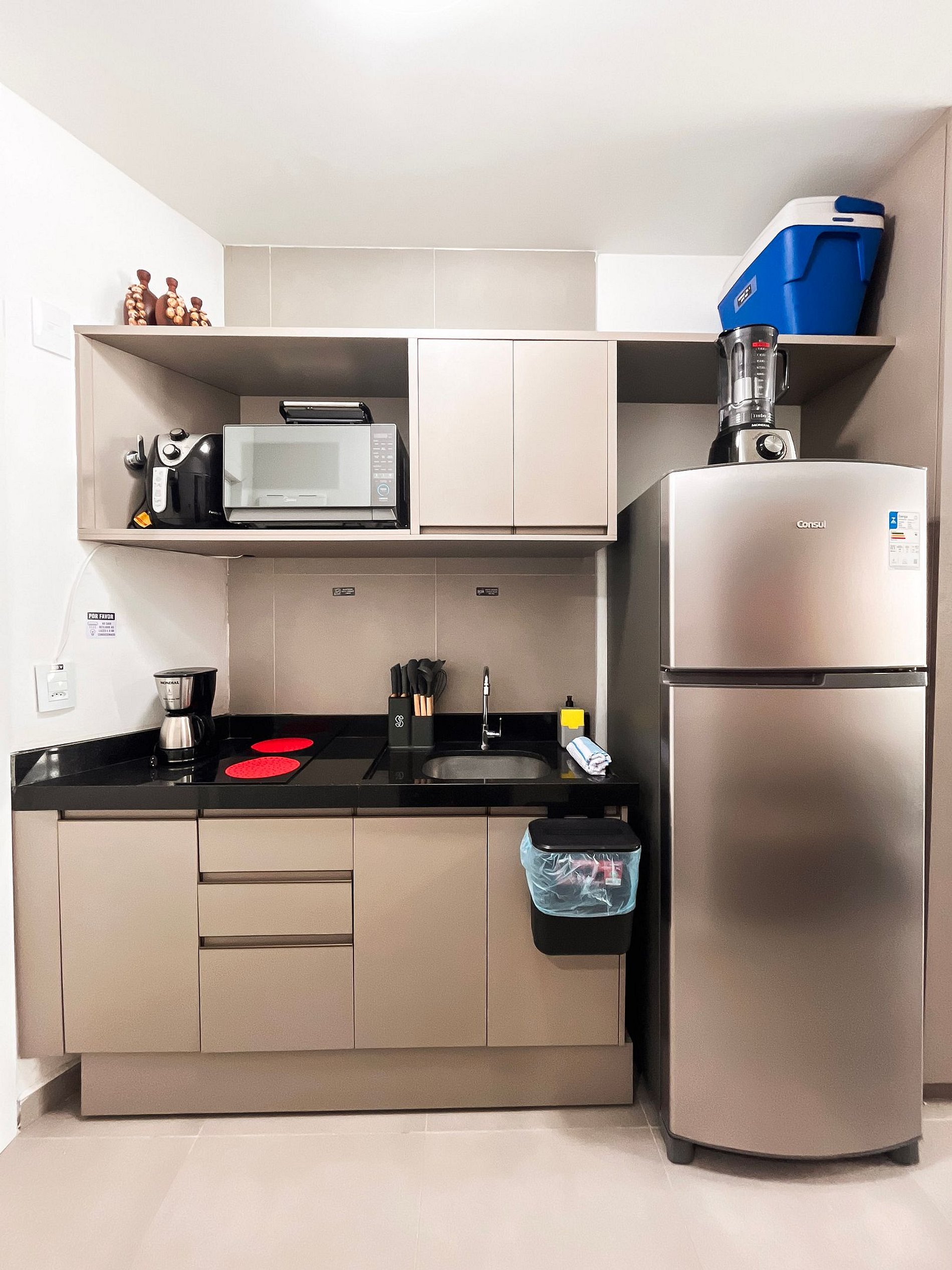 O ambiente possui uma decoração acolhedora e contemporânea. A cozinha está equipada com geladeira, fogão elétrico de 2 bocas, airfryer, micro-ondas, sanduicheira, liquidificador e diversos utensílios. O imóvel oferece TV, ar-condicionado, armários, mesa para refeições e um banheiro completo.