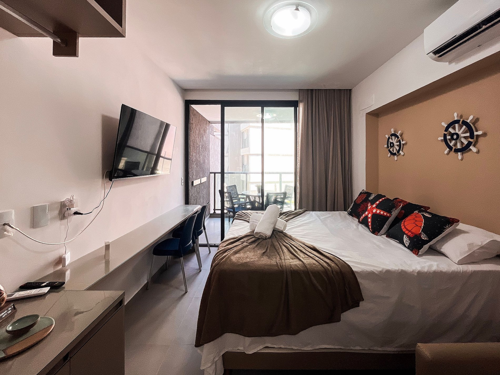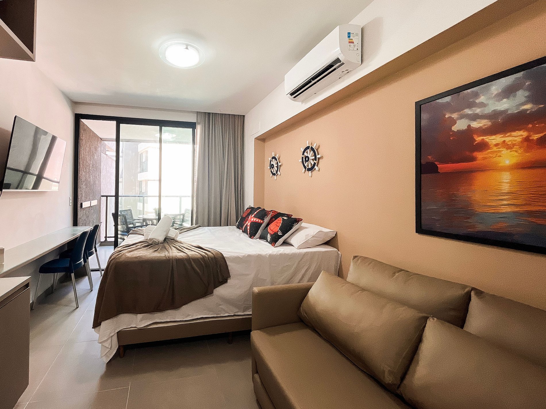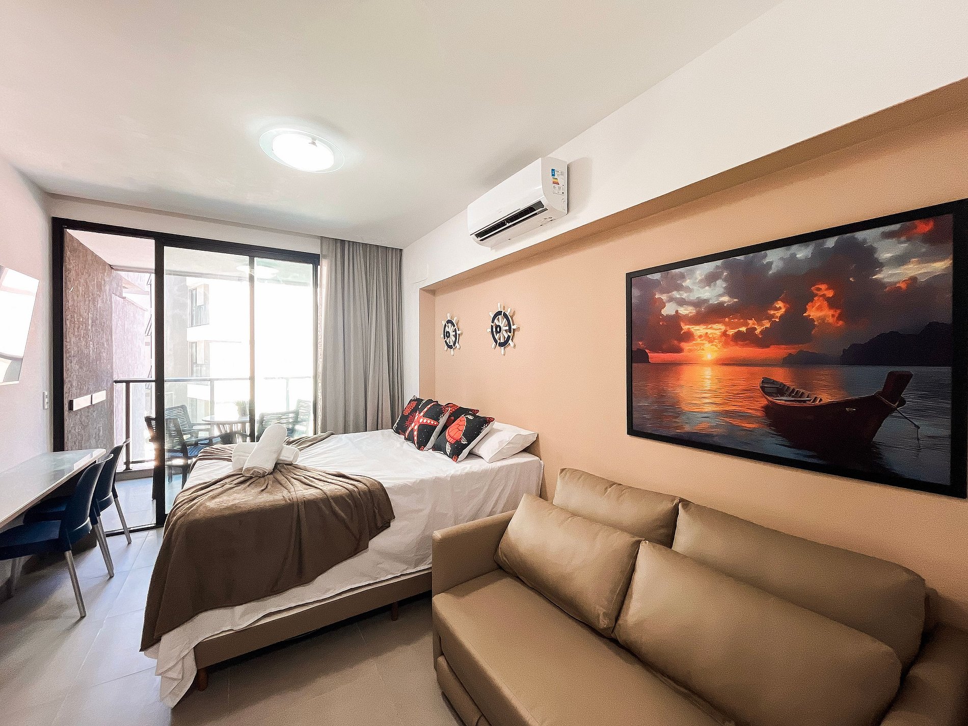 O ambiente possui uma decoração acolhedora e contemporânea. A cozinha está equipada com geladeira, fogão elétrico de 2 bocas, airfryer, micro-ondas, sanduicheira, liquidificador e diversos utensílios. O imóvel oferece TV, ar-condicionado, armários, mesa para refeições e um banheiro completo.