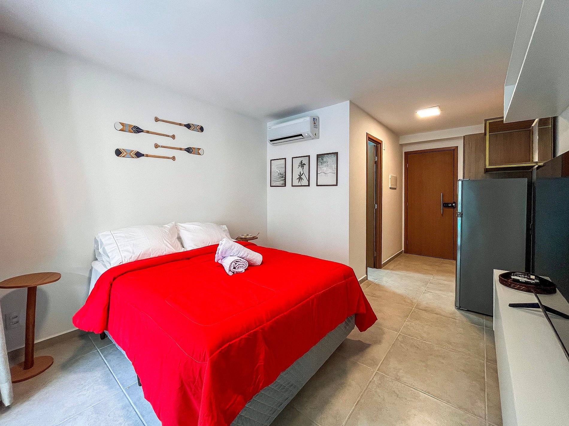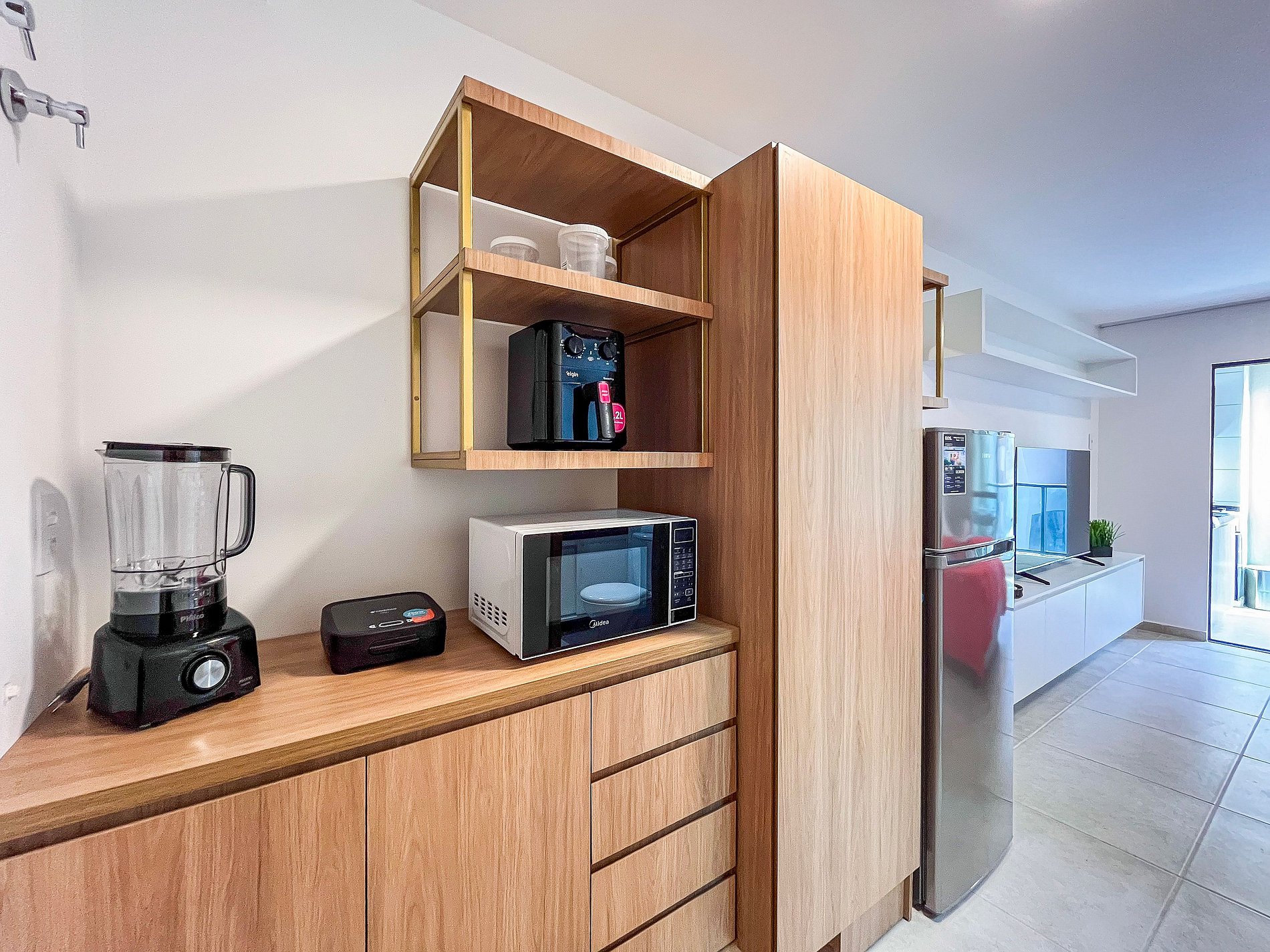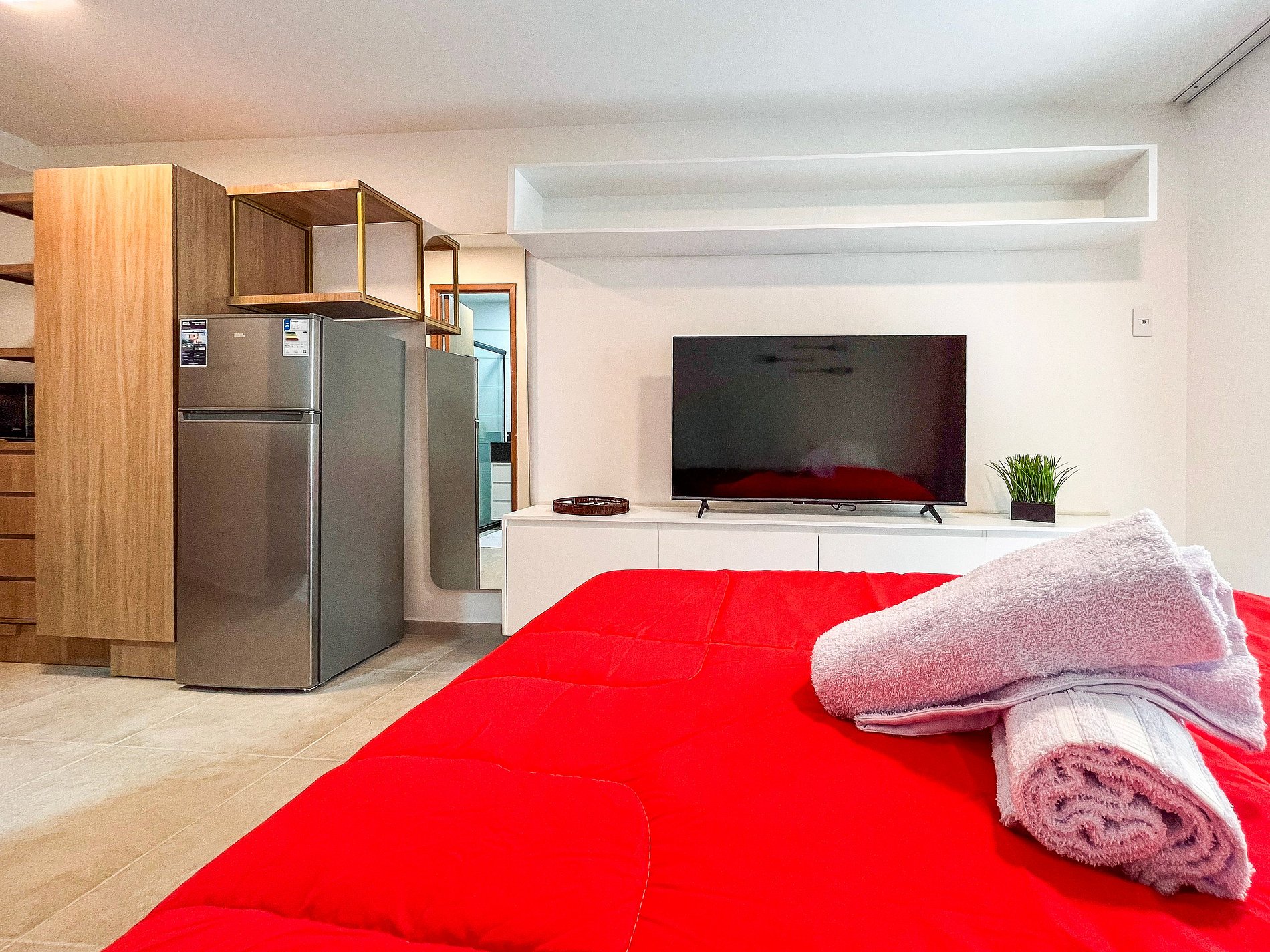 O studio foi planejado para oferecer praticidade e conforto durante toda a estadia: