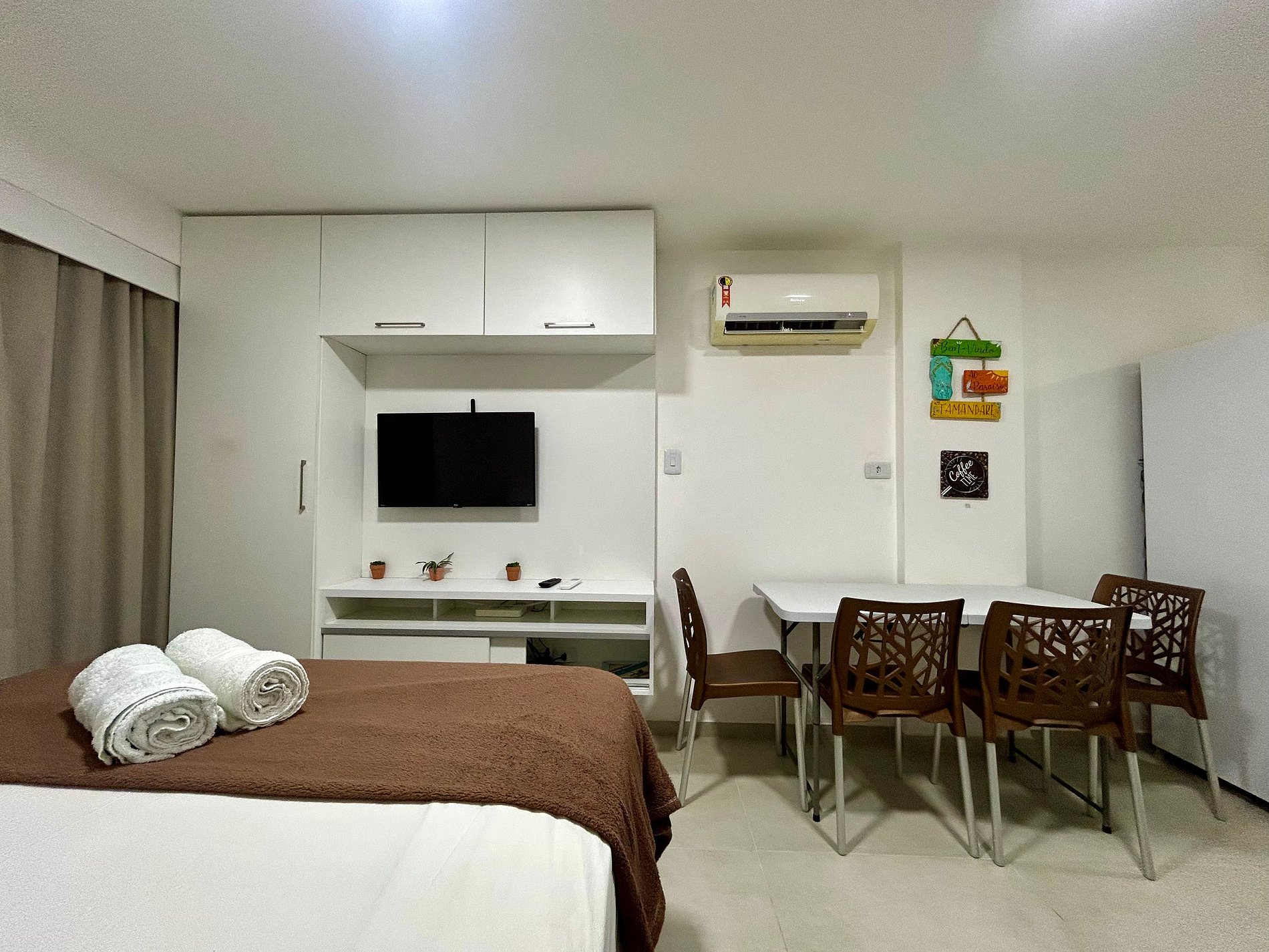 Apartamento estúdio aconchegante, em área central de Tamandaré, com fácil acesso e ambiente tranquilo. O edifício oferece piscina na cobertura e área com churrasqueira. O espaço é funcional e acolhedor, equipado com toalhas, roupas de cama, ar-condicionado, TV e Wi-Fi. Acomoda até 4 pessoas, com cama de casal e sofá-cama.