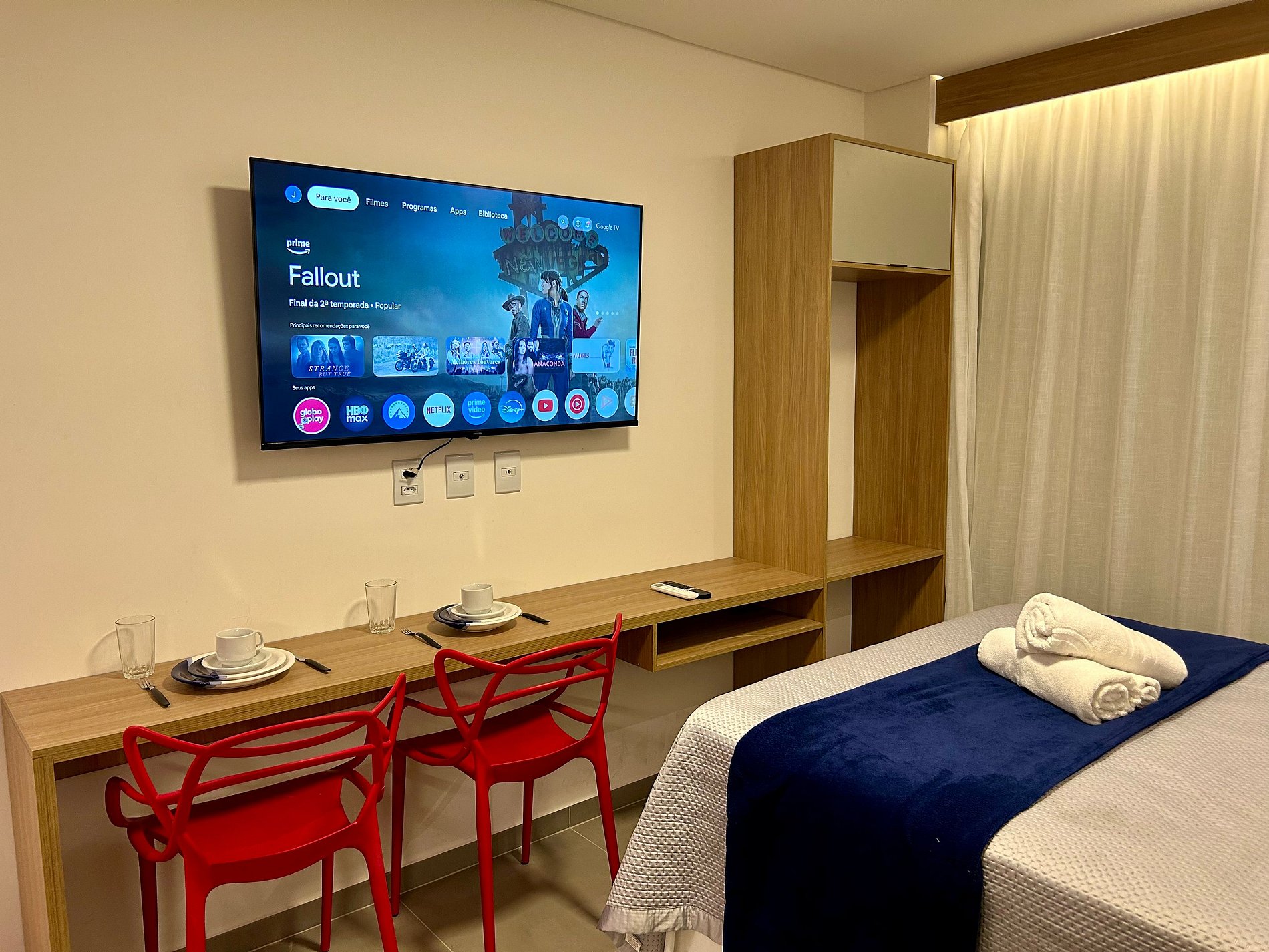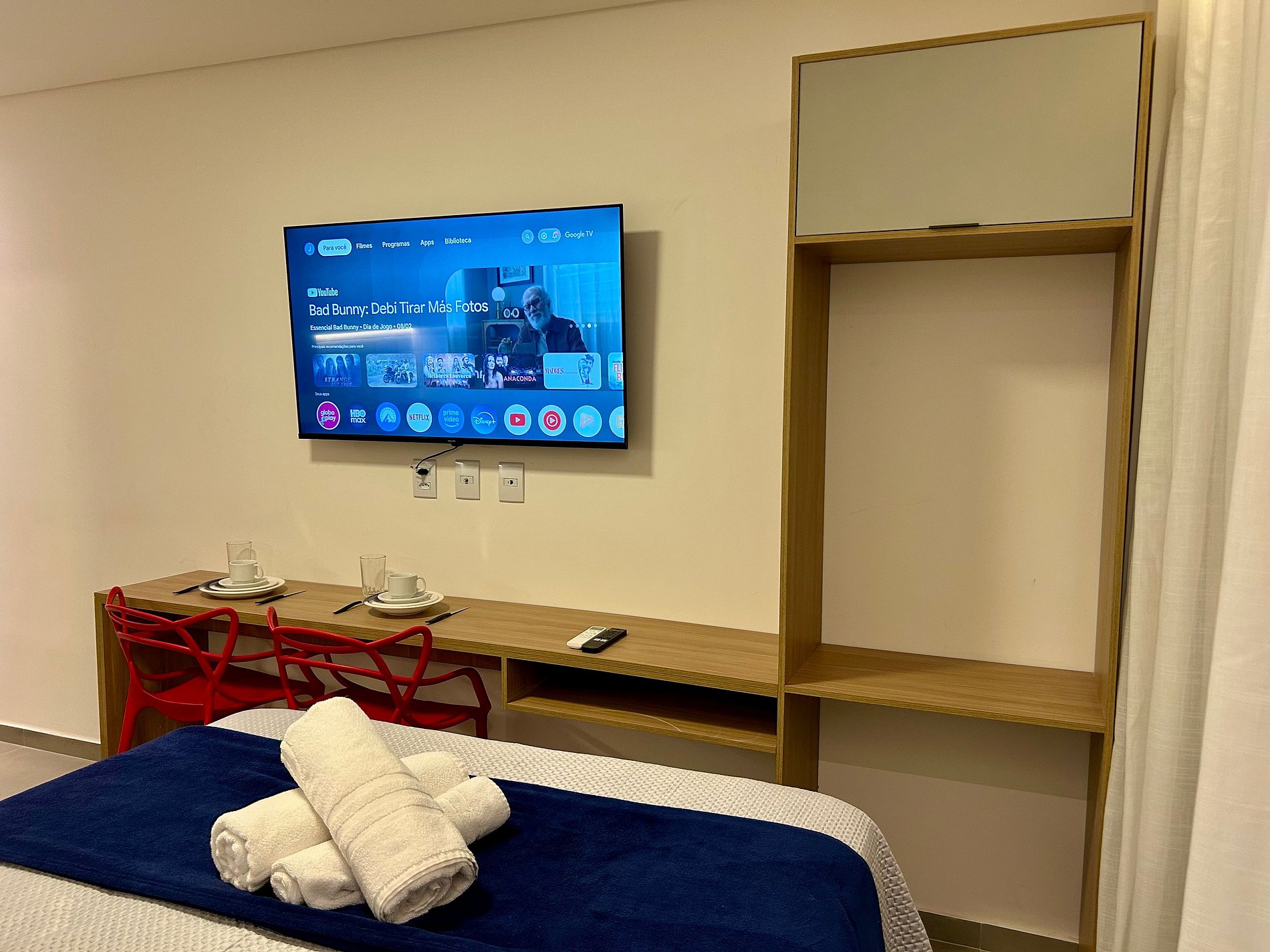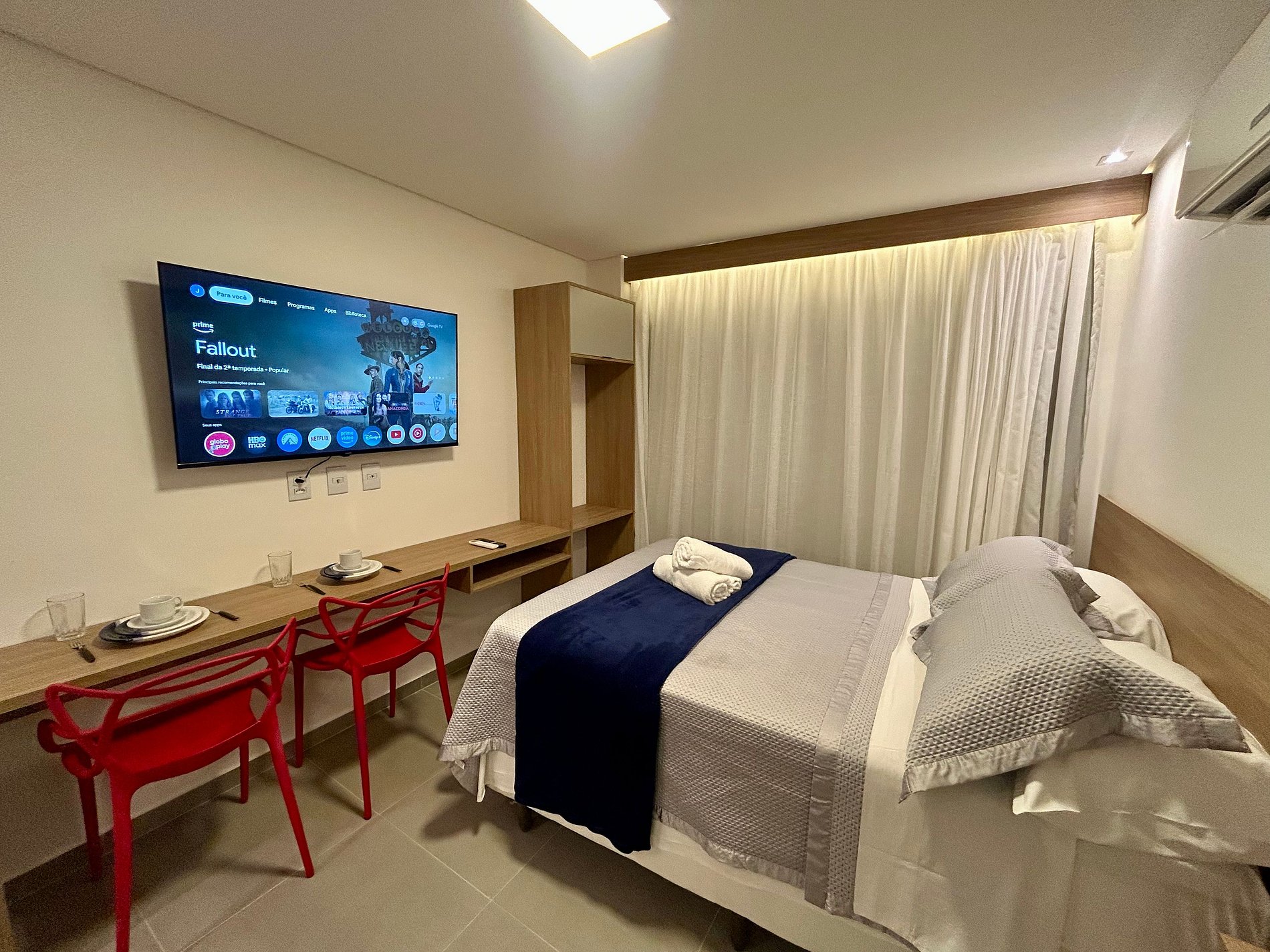 O ambiente é cuidadosamente planejado, com uma confortável cama de casal que garante boas noites de descanso, além de Smart TV para momentos de lazer e Wi-Fi de alta velocidade para quem precisa se manter conectado.