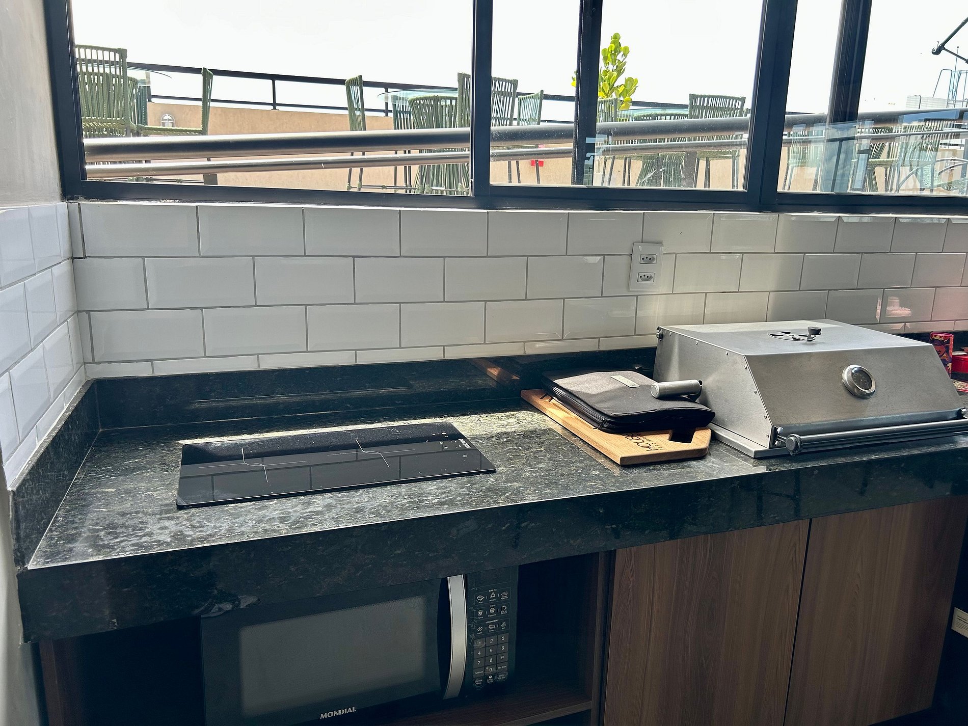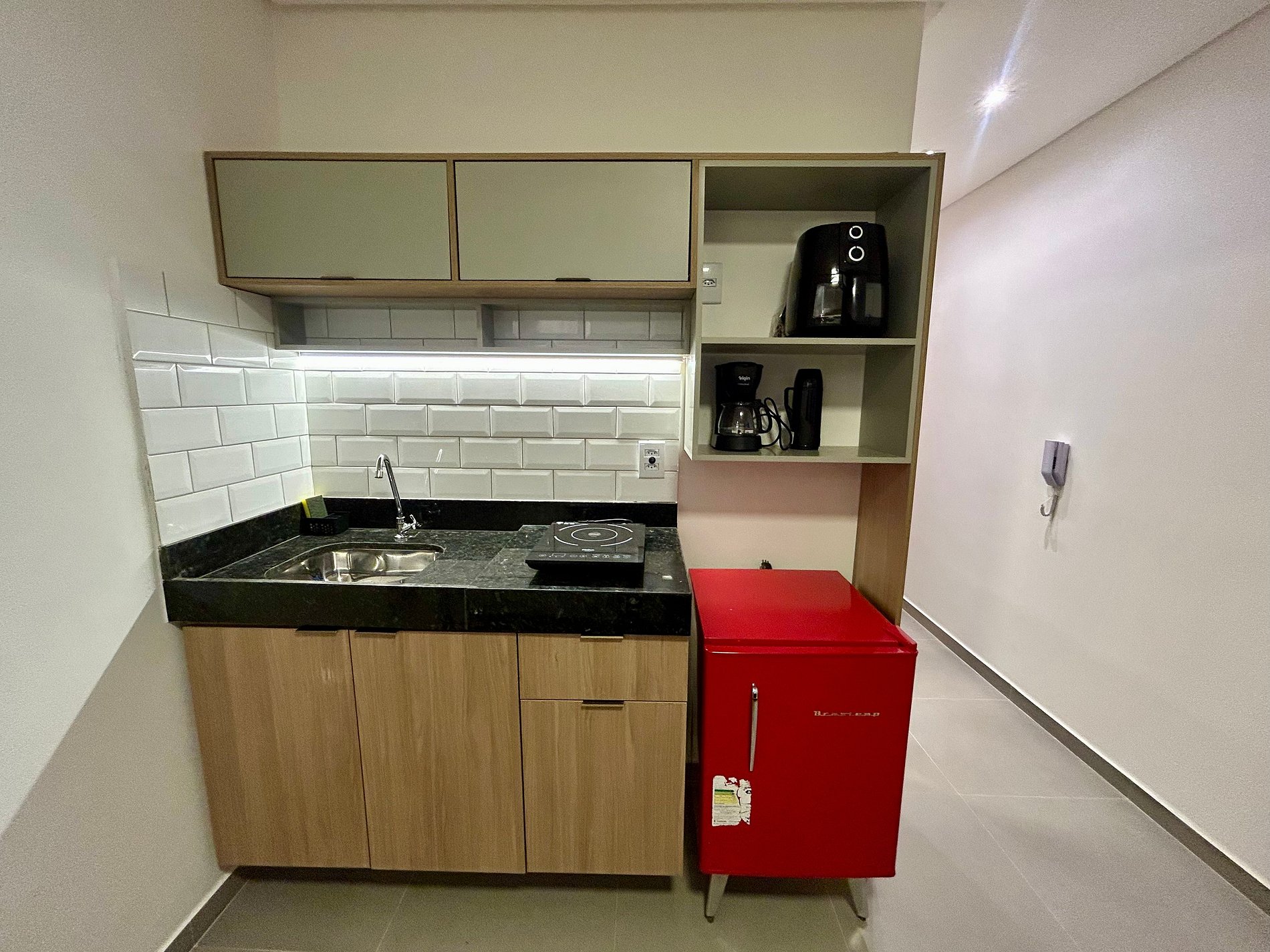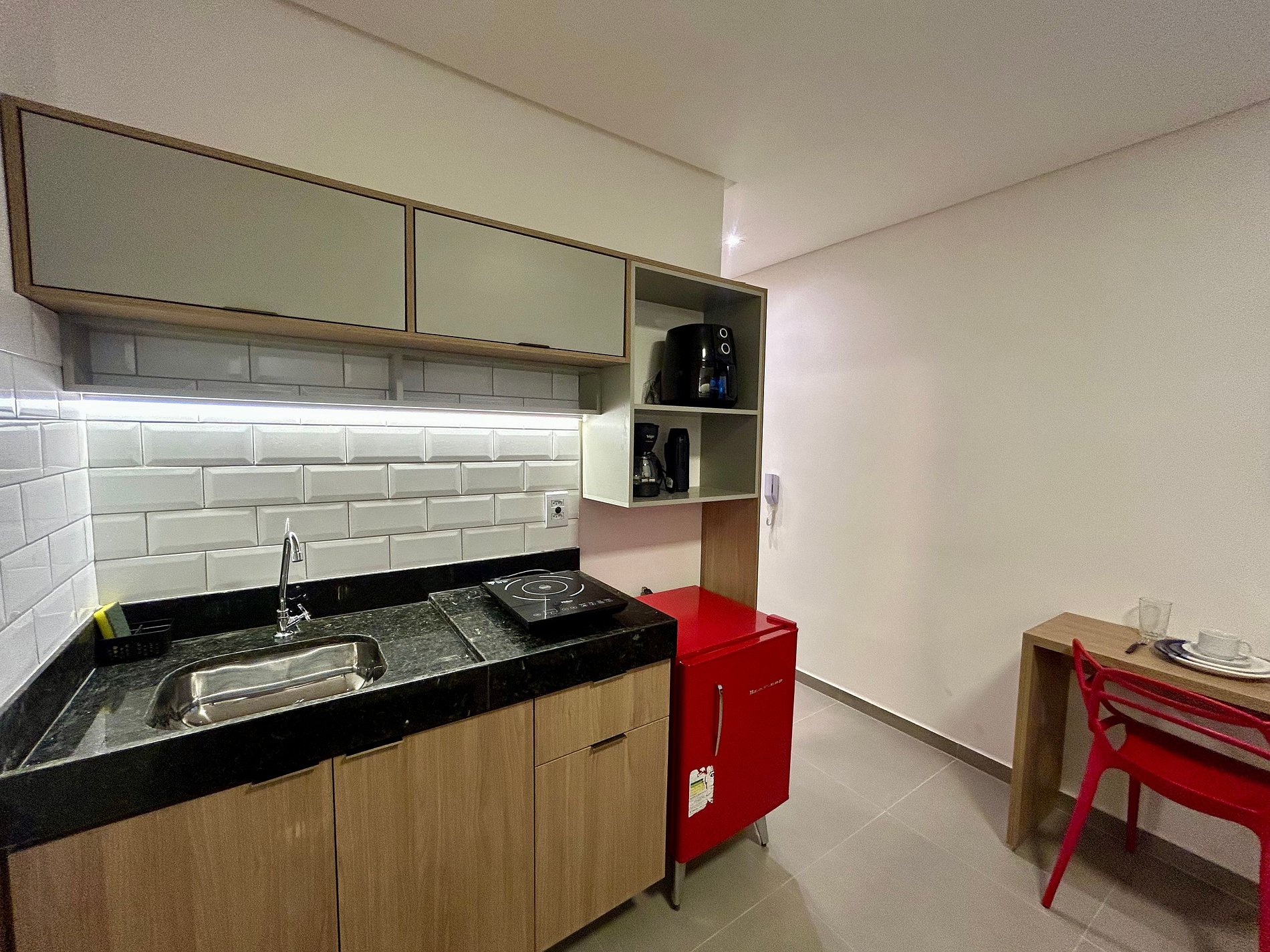 A cozinha compacta é completa e funcional, equipada com os itens essenciais para preparar refeições rápidas no dia a dia, trazendo mais autonomia durante a estadia.